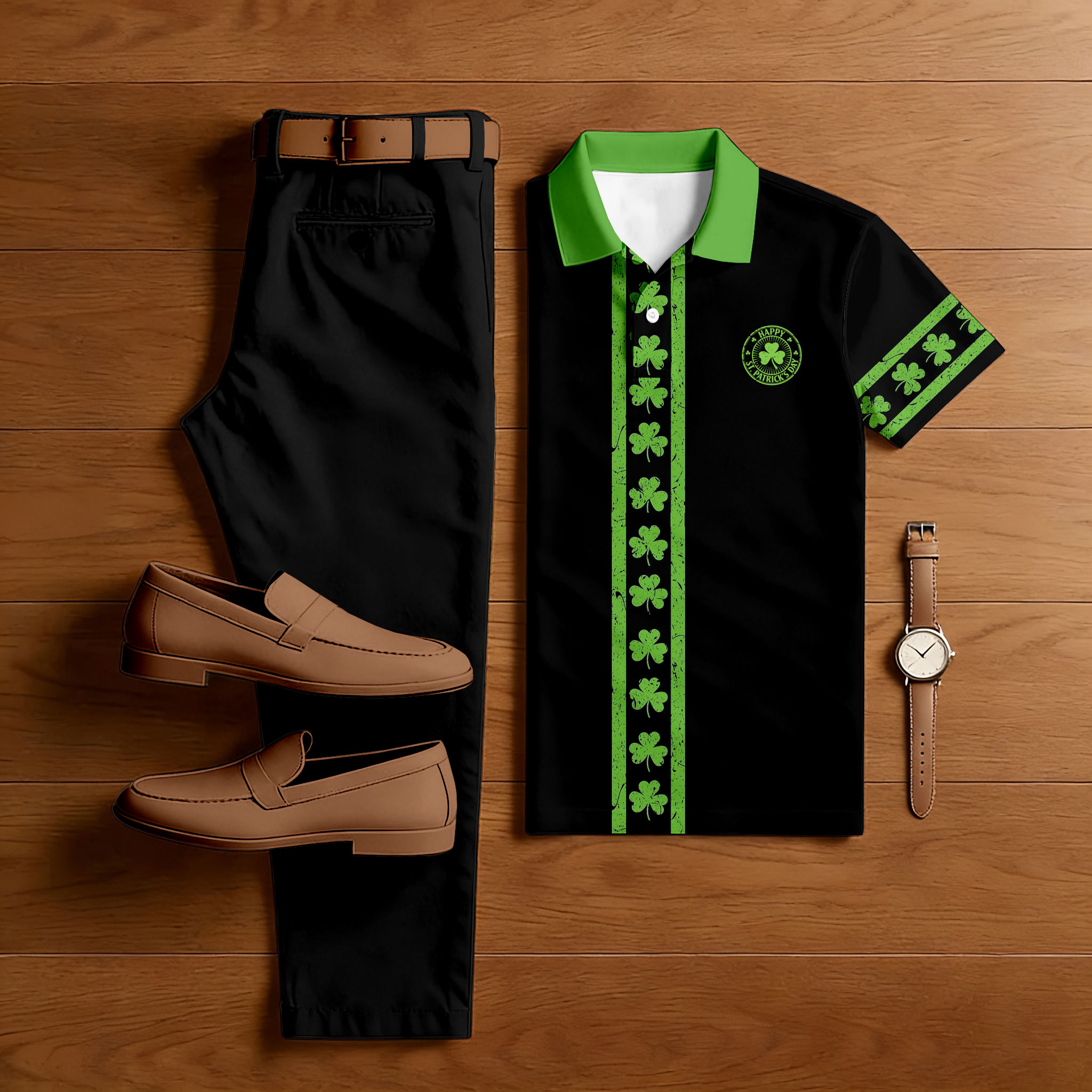 Men's Casual Green & Black Color Matching St. Patrick's Day Checkered Printed Short Sleeved Polo Shirt & Trousers Two-Piece Set