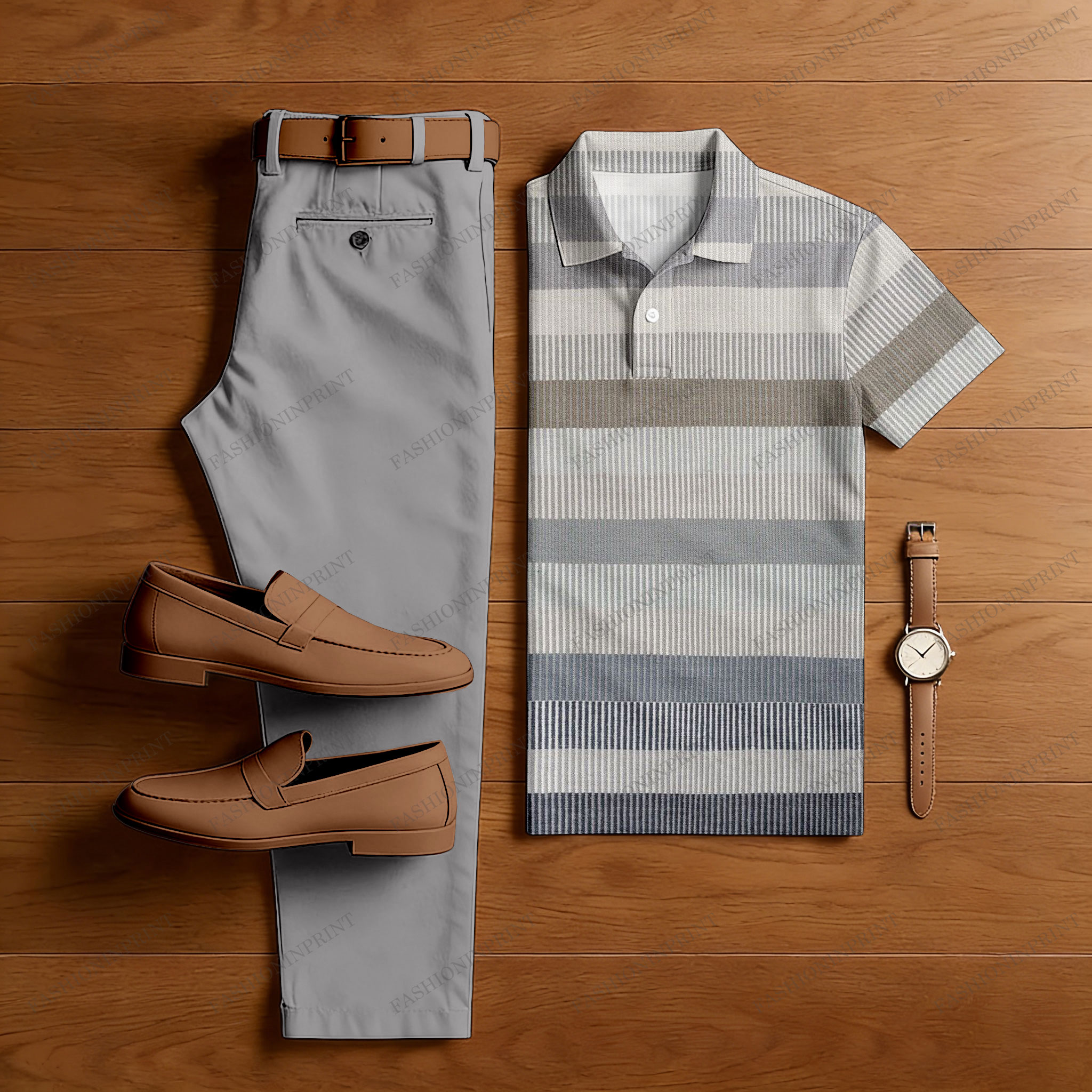 Men's Casual Gray & Oatmeal Color Matching Striped Printed Short Sleeved Polo Shirt & Trousers Two-Piece Set