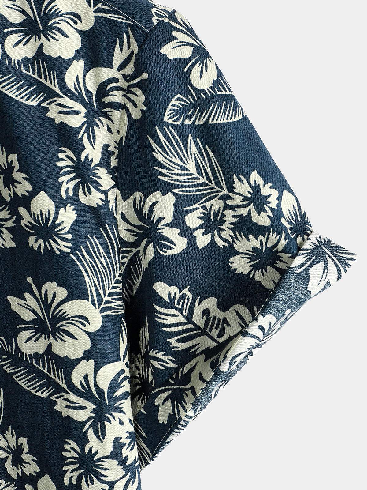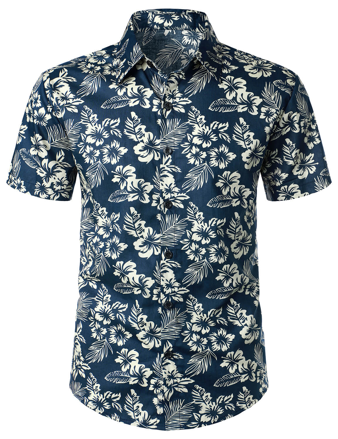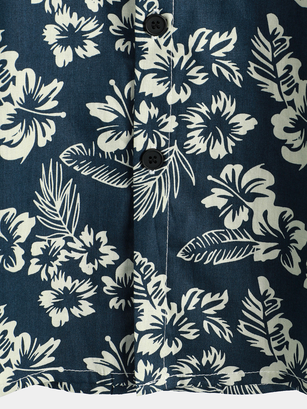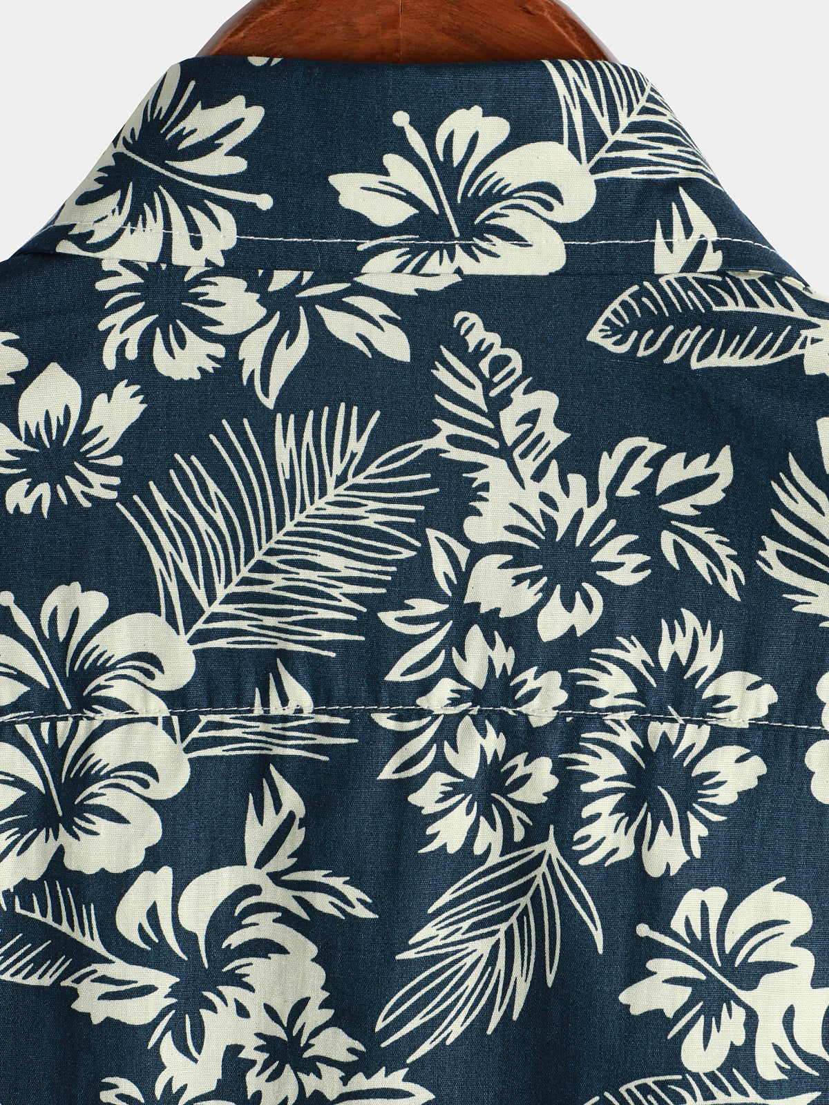 Men's Floral Print Vacation Cotton Breathable Navy Blue Hawaiian Short Sleeve Aloha Shirt