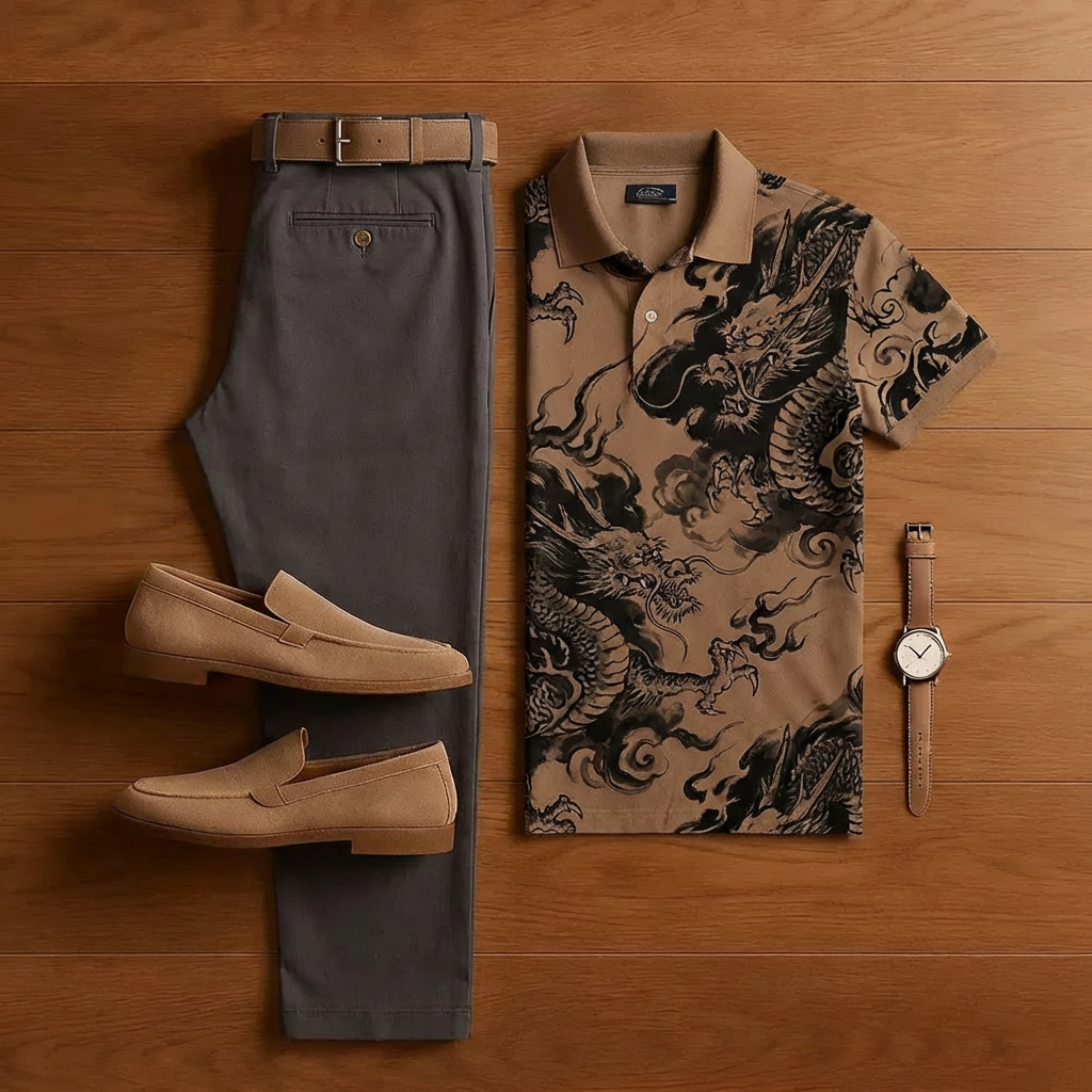Men's Retro Brown & Black Printed Short-Sleeve Shirt And Trousers Two-Piece Set