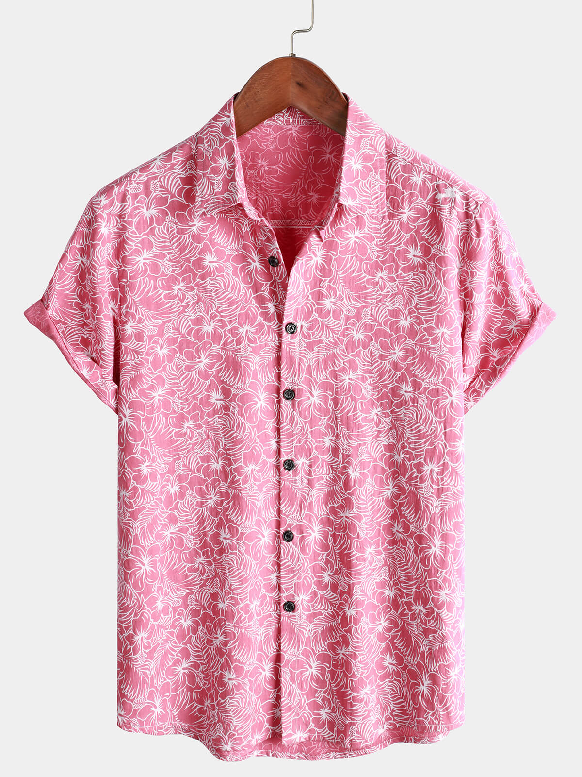 Men's Cotton Floral Holiday Flower Print Button Up Beach Pink Hawaiian Short Sleeve Shirt