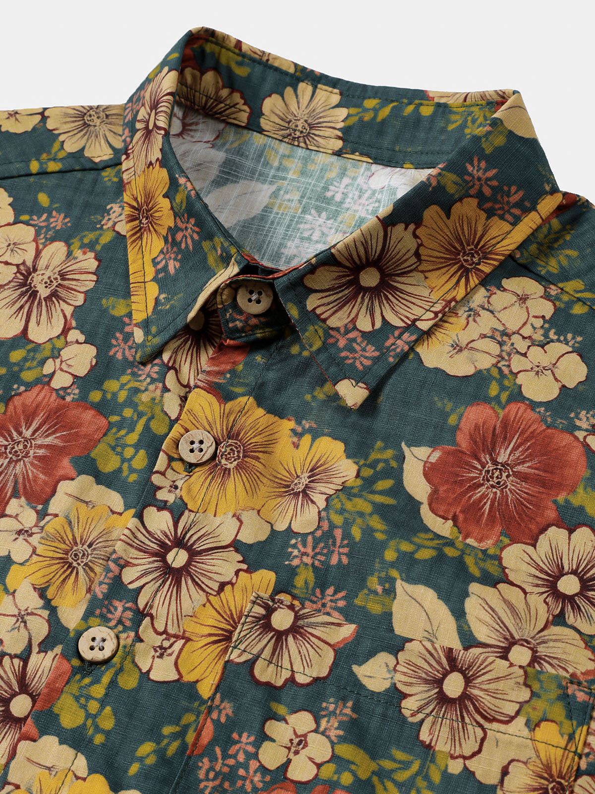 Men's Vintage Botanical Print Resort Breathable Short Sleeve Cotton Shirt