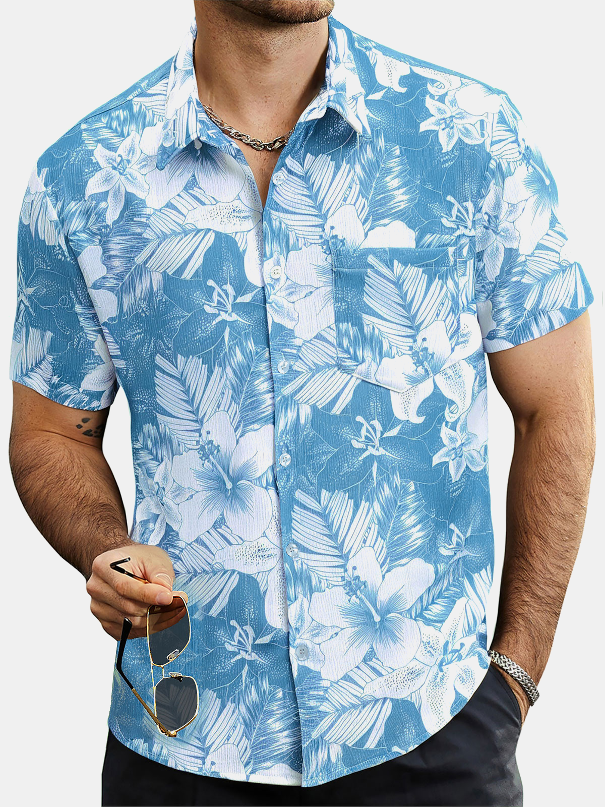 Men’s Blue Tropical Print Summer Beach Short Sleeve Shirt