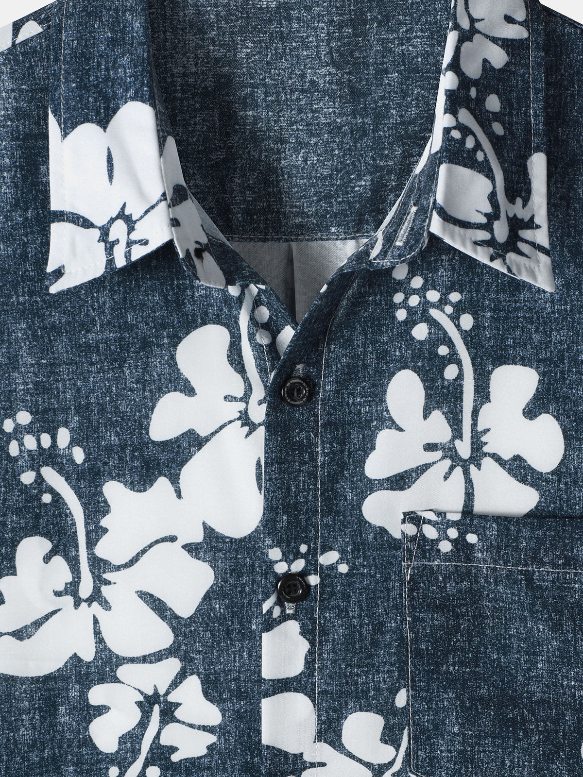 Men's Floral Hawaiian Pocket Navy Blue Button Up Short Sleeve Shirt