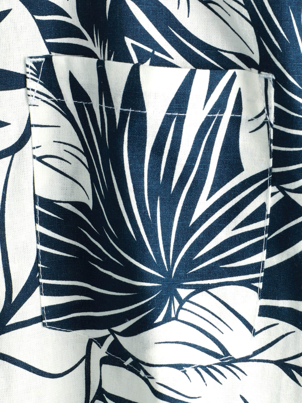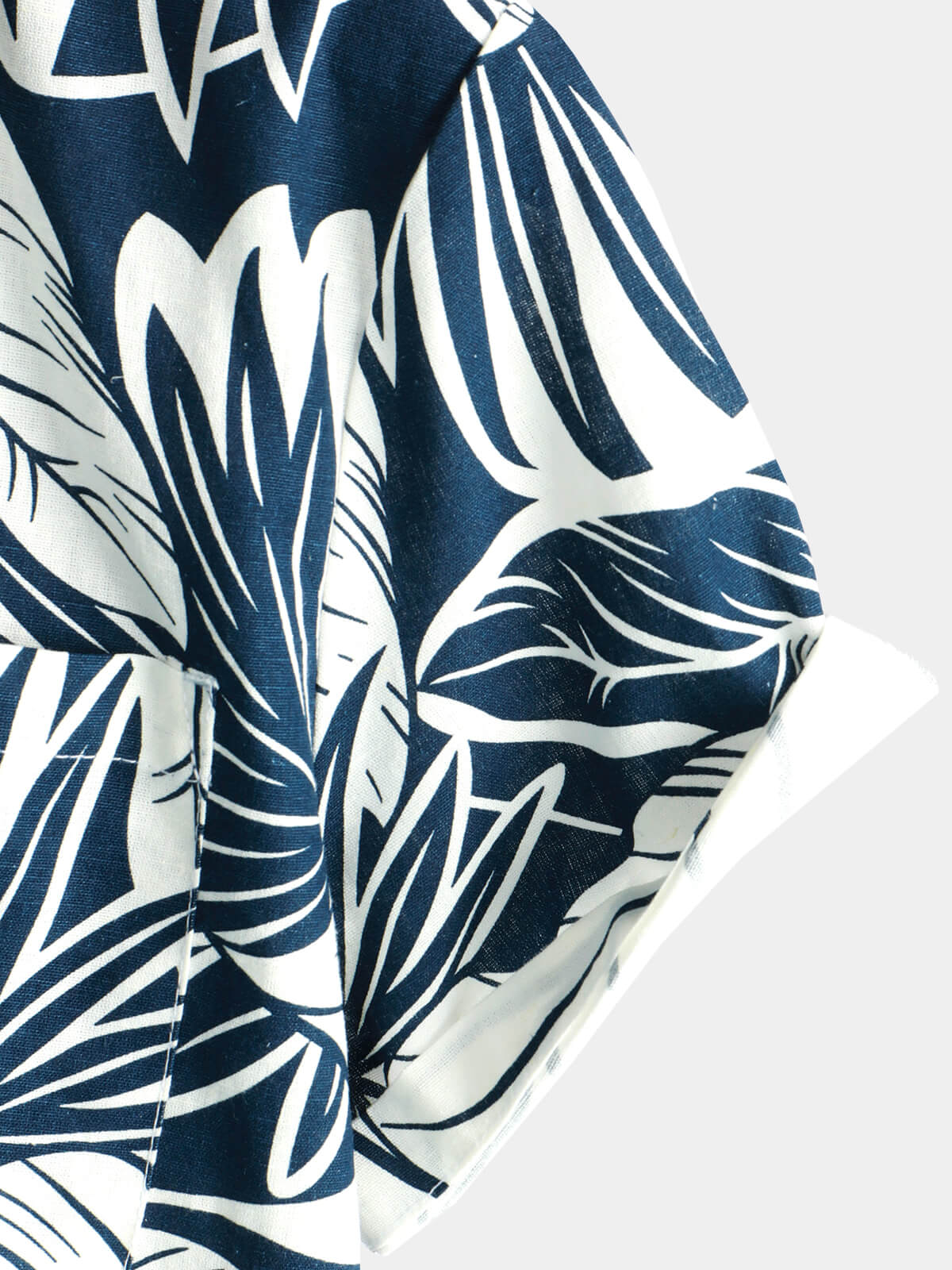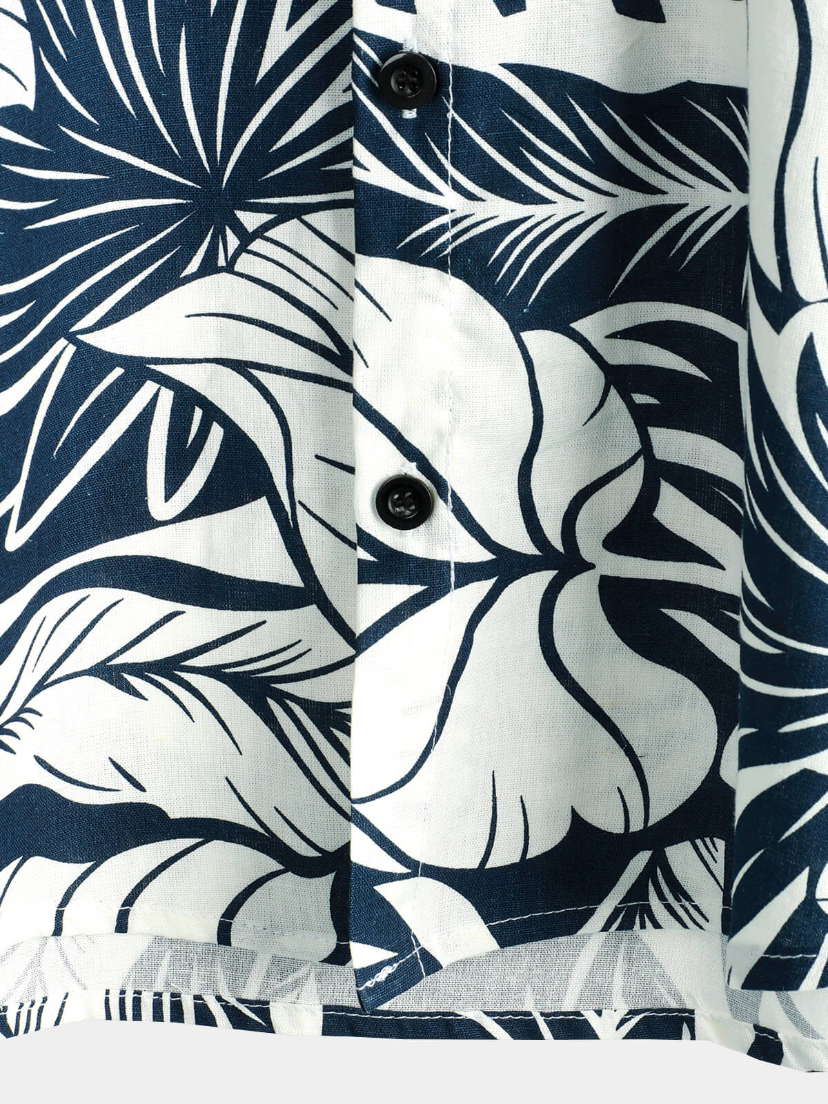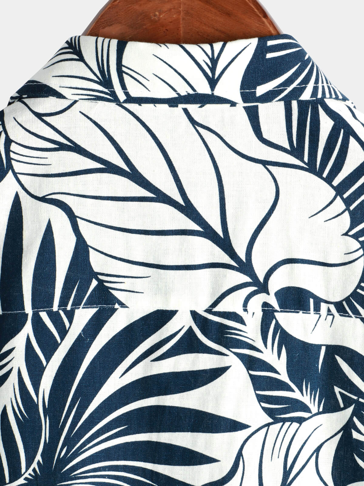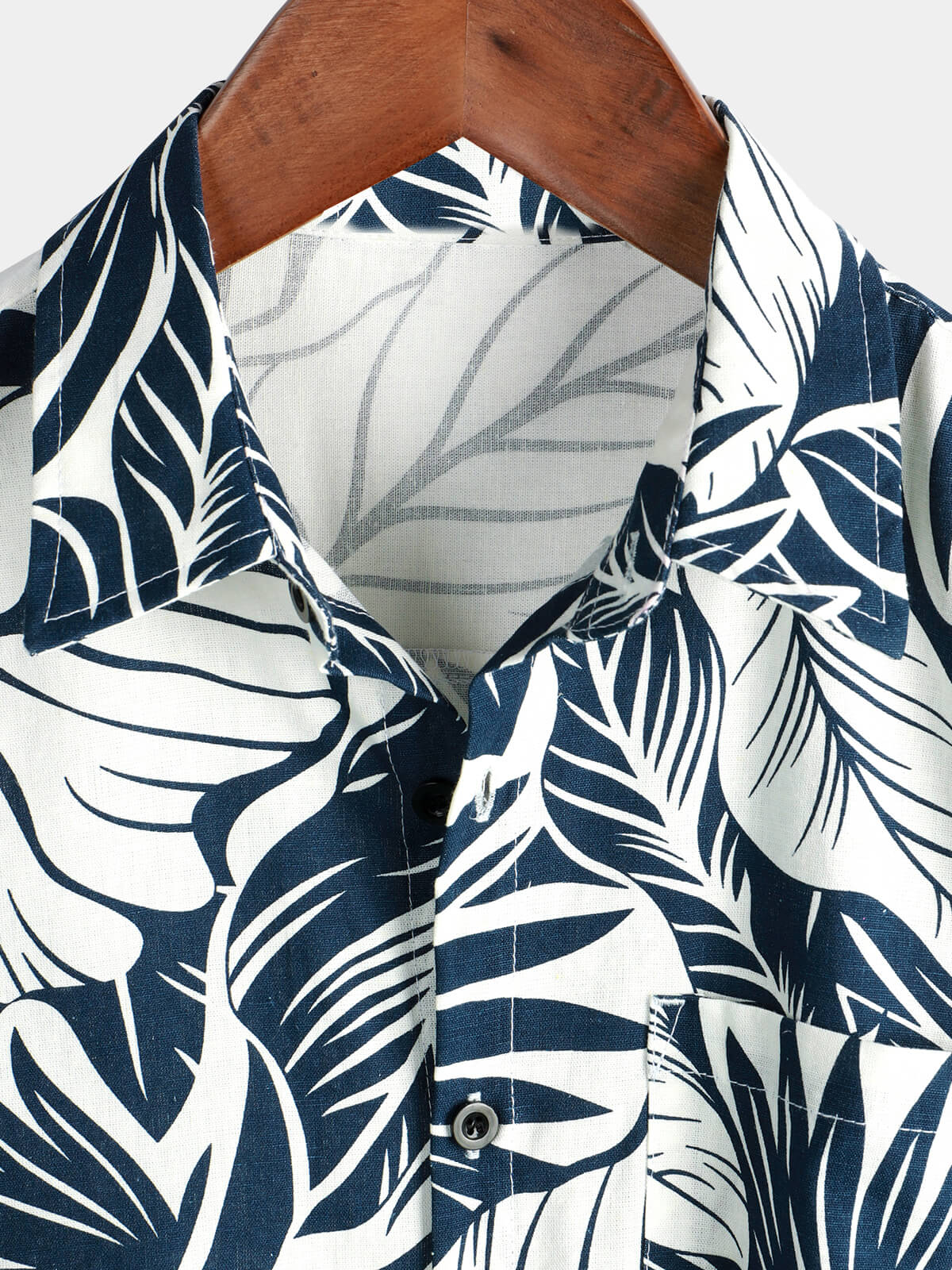 Men's Tropical Plant Print Pocket Cotton Linen Hawaiian Short Sleeve Shirt