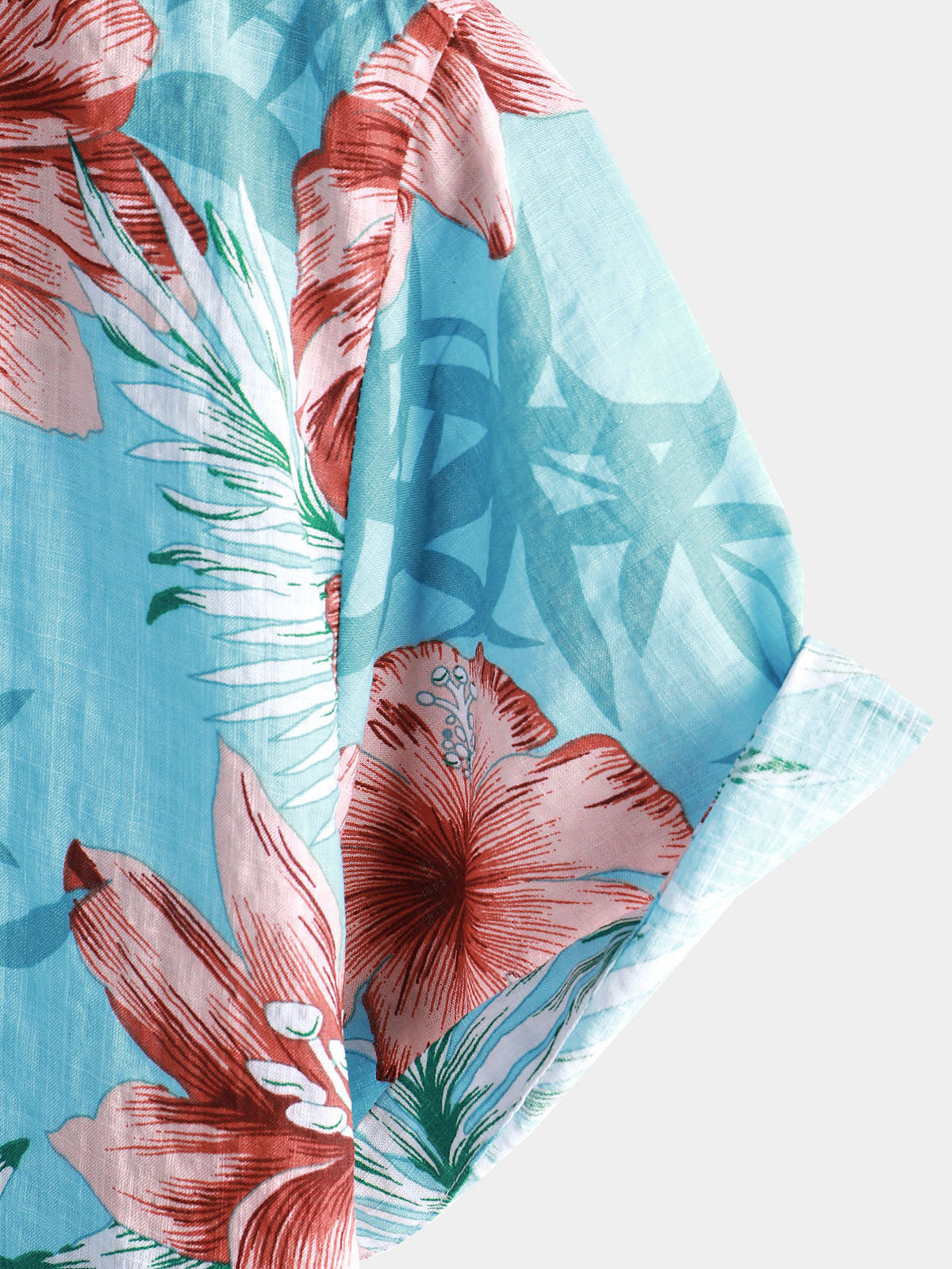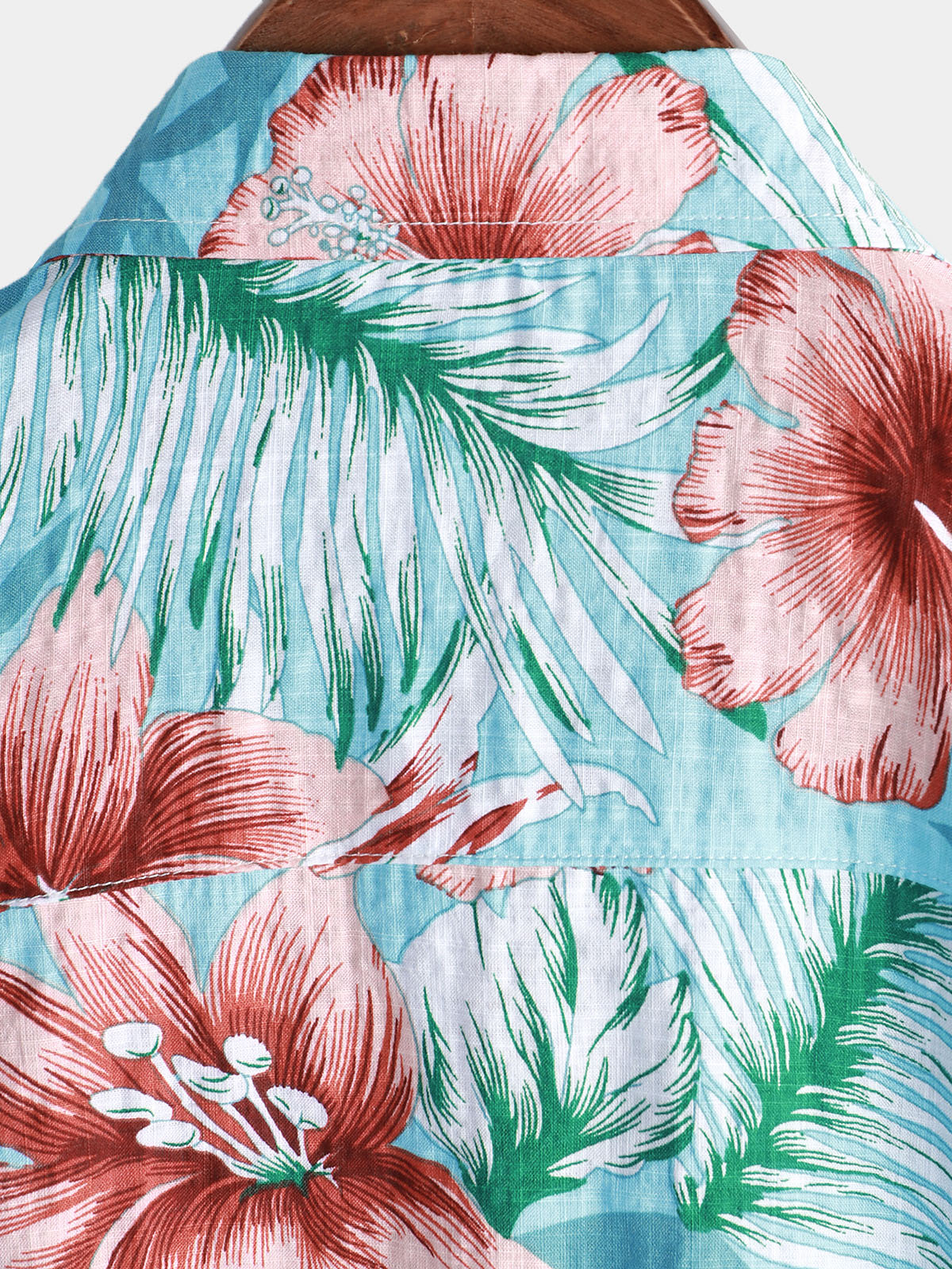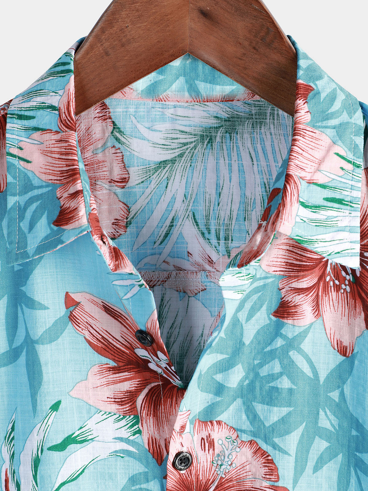 Men's Hawaiian Tropical Button Hibiscus Floral Print Vacation Beach Blue Short Sleeve Shirt