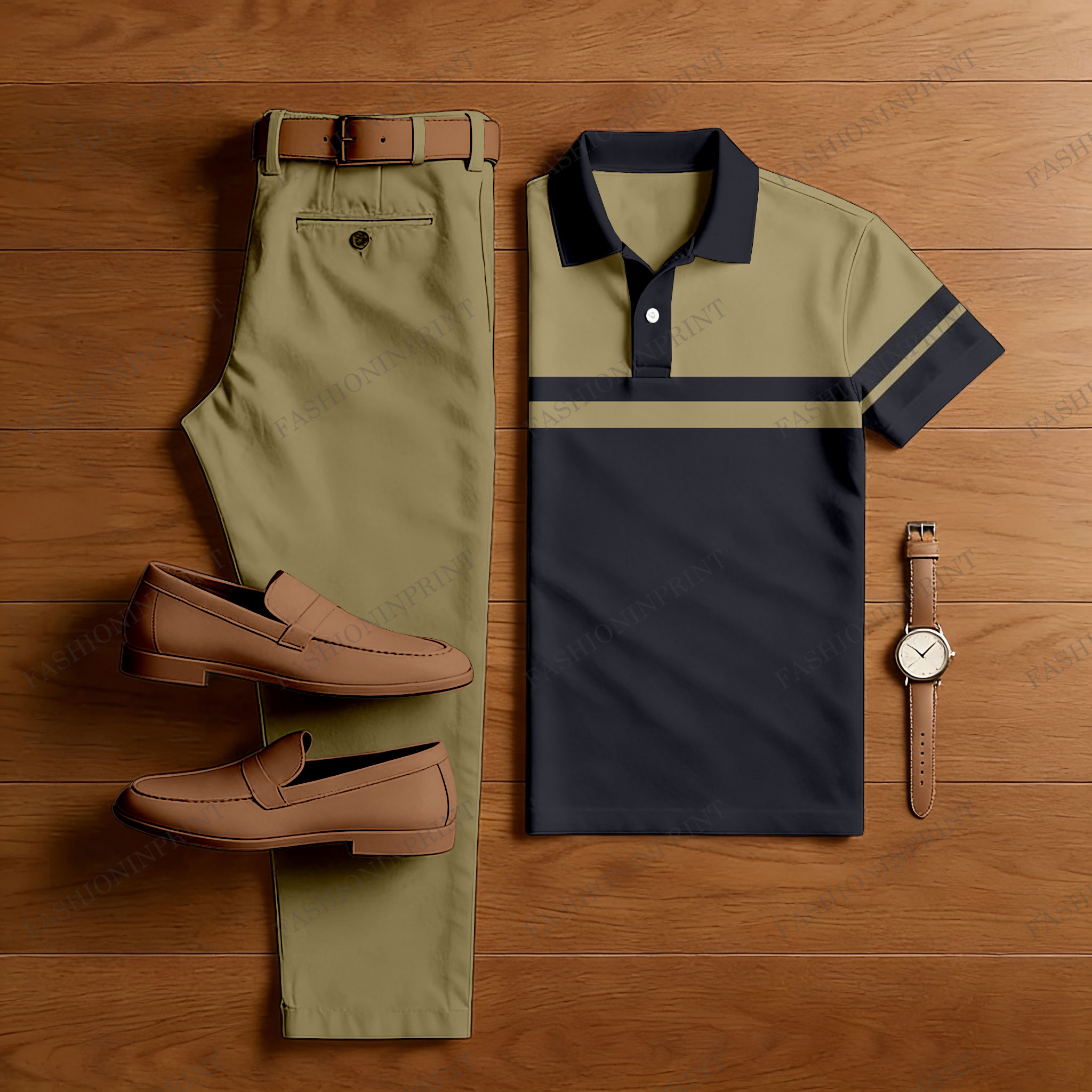 Men's Casual Army Green & Dark Navy Blue Color Matching Printed Short Sleeved Polo Shirt & Trousers Two-Piece Set