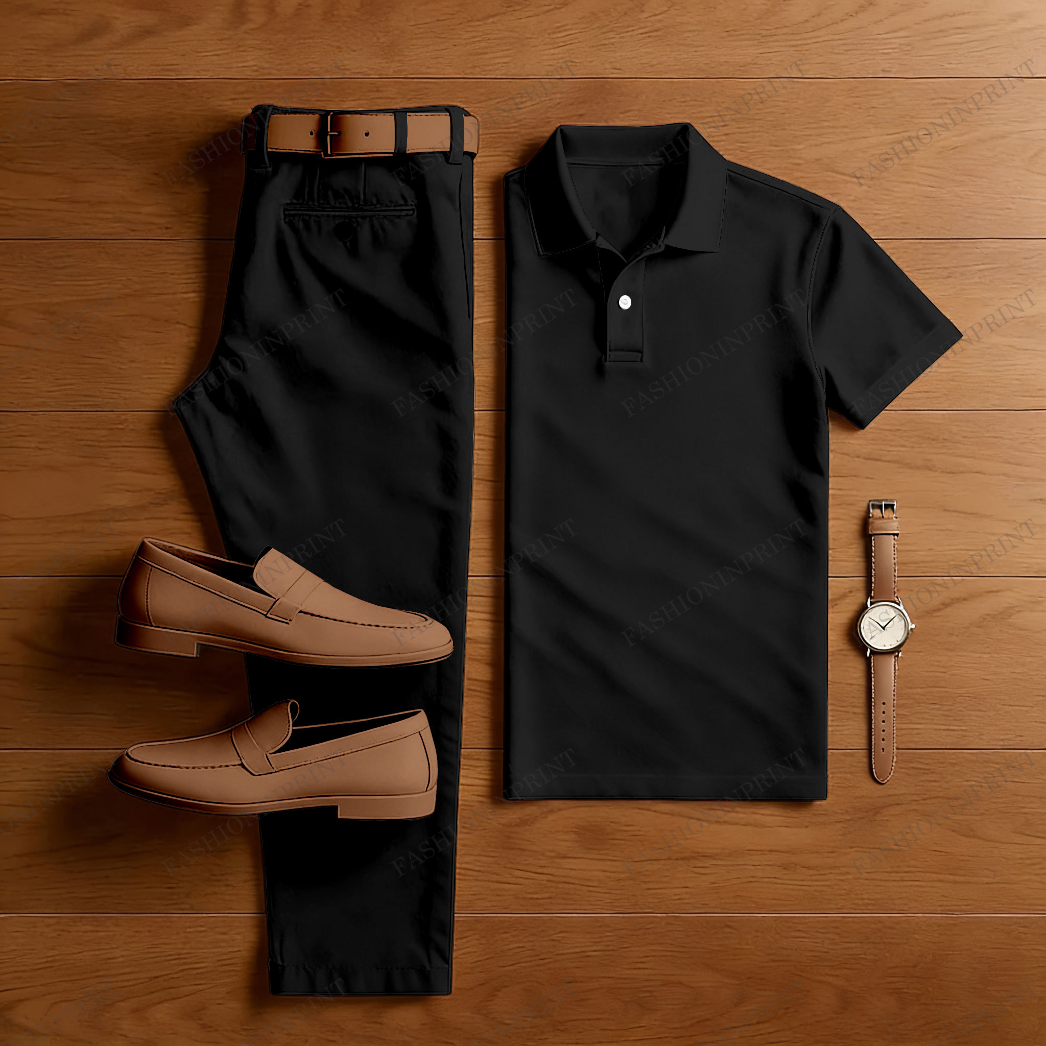Men's Casual Black Short Sleeved Polo Shirt & Trousers Two-Piece Set