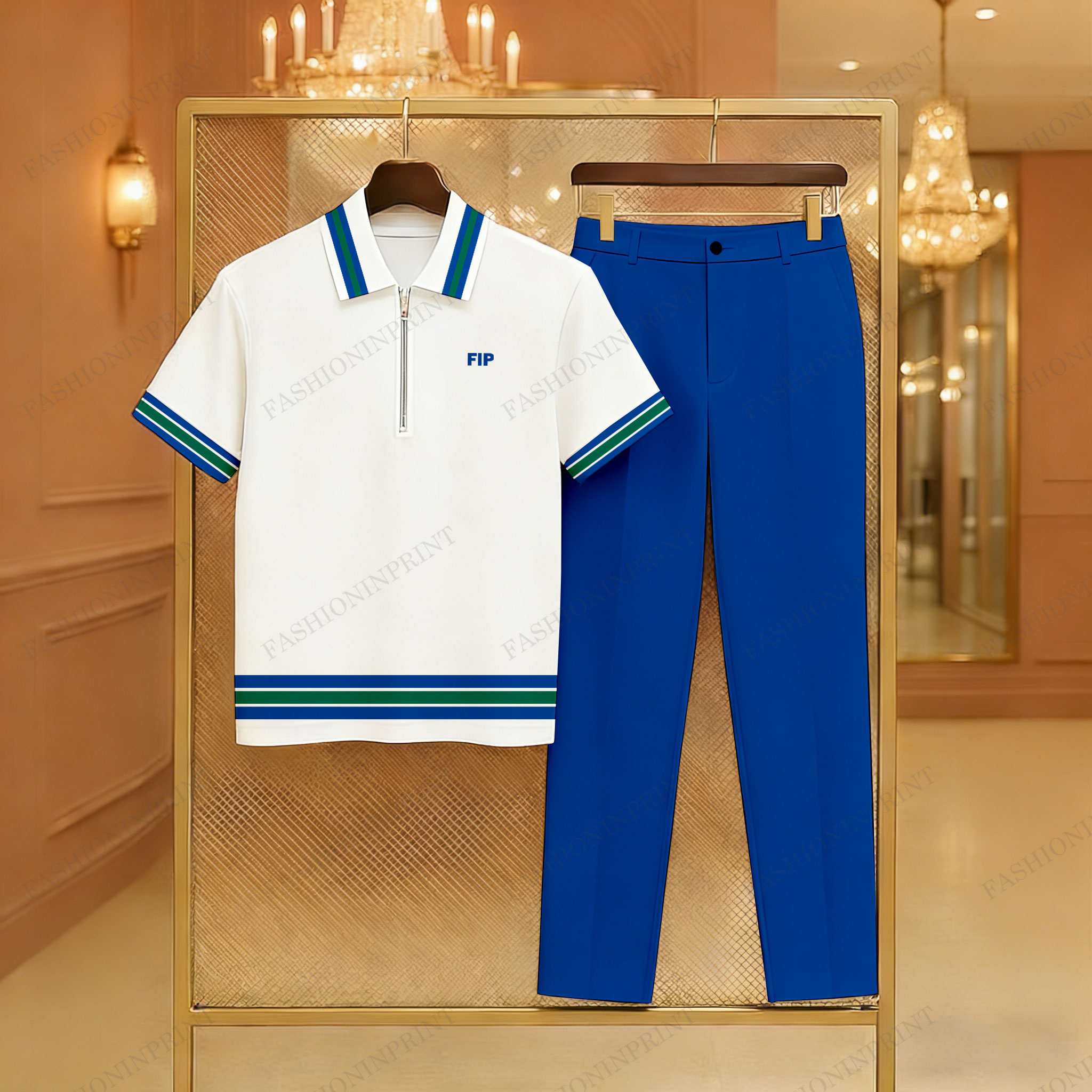 Men's Casual Blue & White Color Matching Striped Printed Zipper Short Sleeved Polo Shirt & Trousers Two-Piece Set