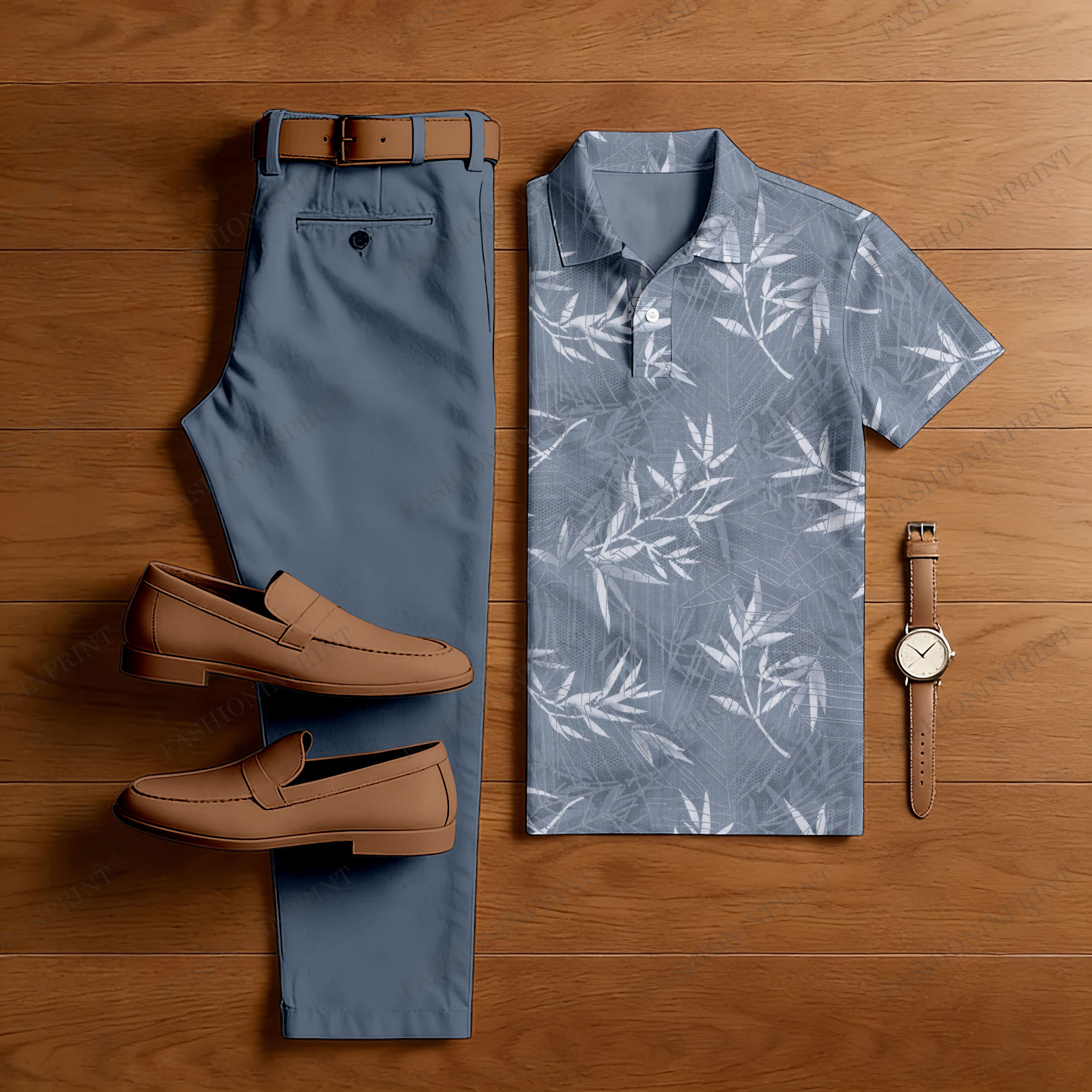 Men's Casual Gray Color Matching Ethnic Style Printed Short Sleeved Polo Shirt & Trousers Two-Piece Set