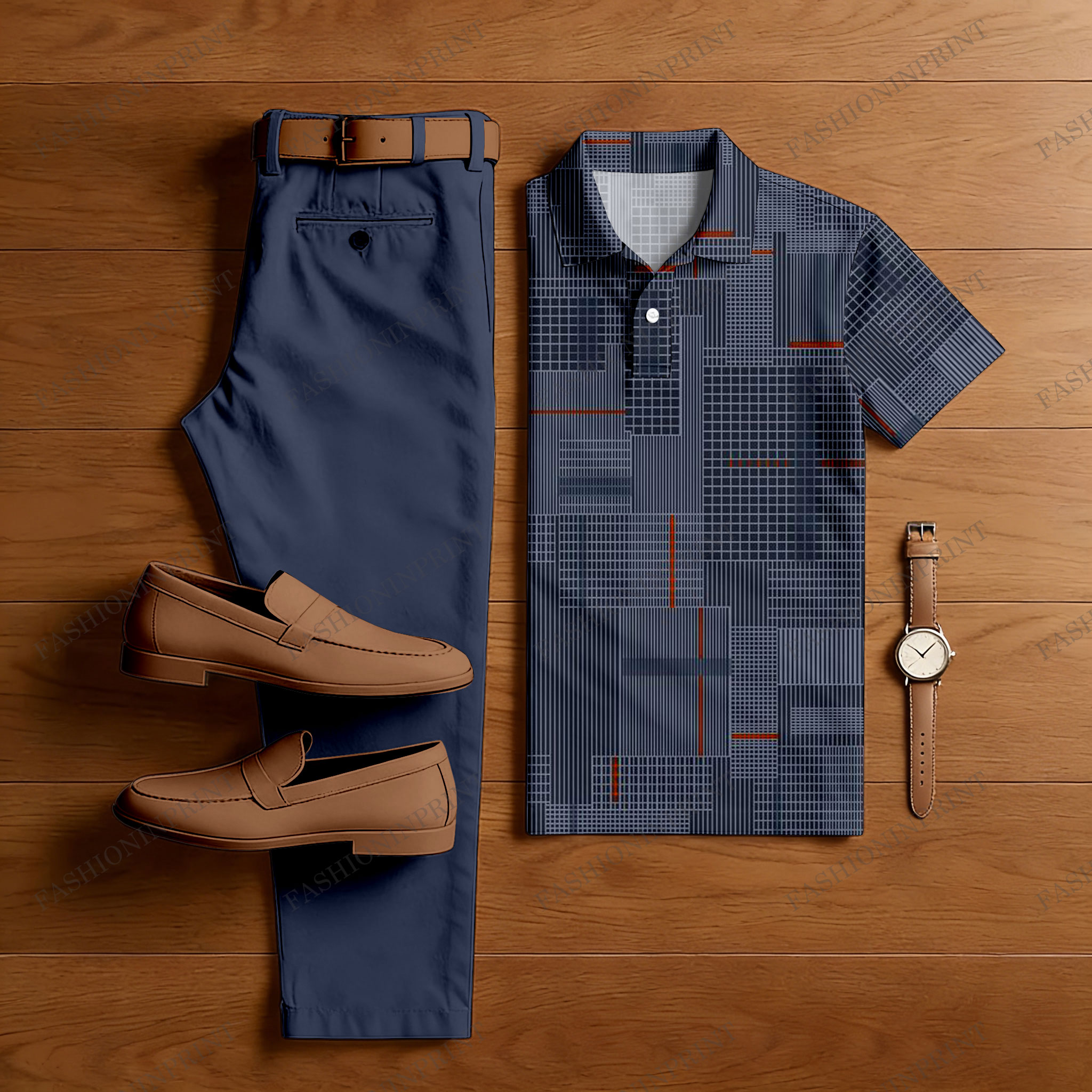 Men's Casual Navy Blue Color Matching Checkered Printed Short Sleeved Polo Shirt & Trousers Two-Piece Set