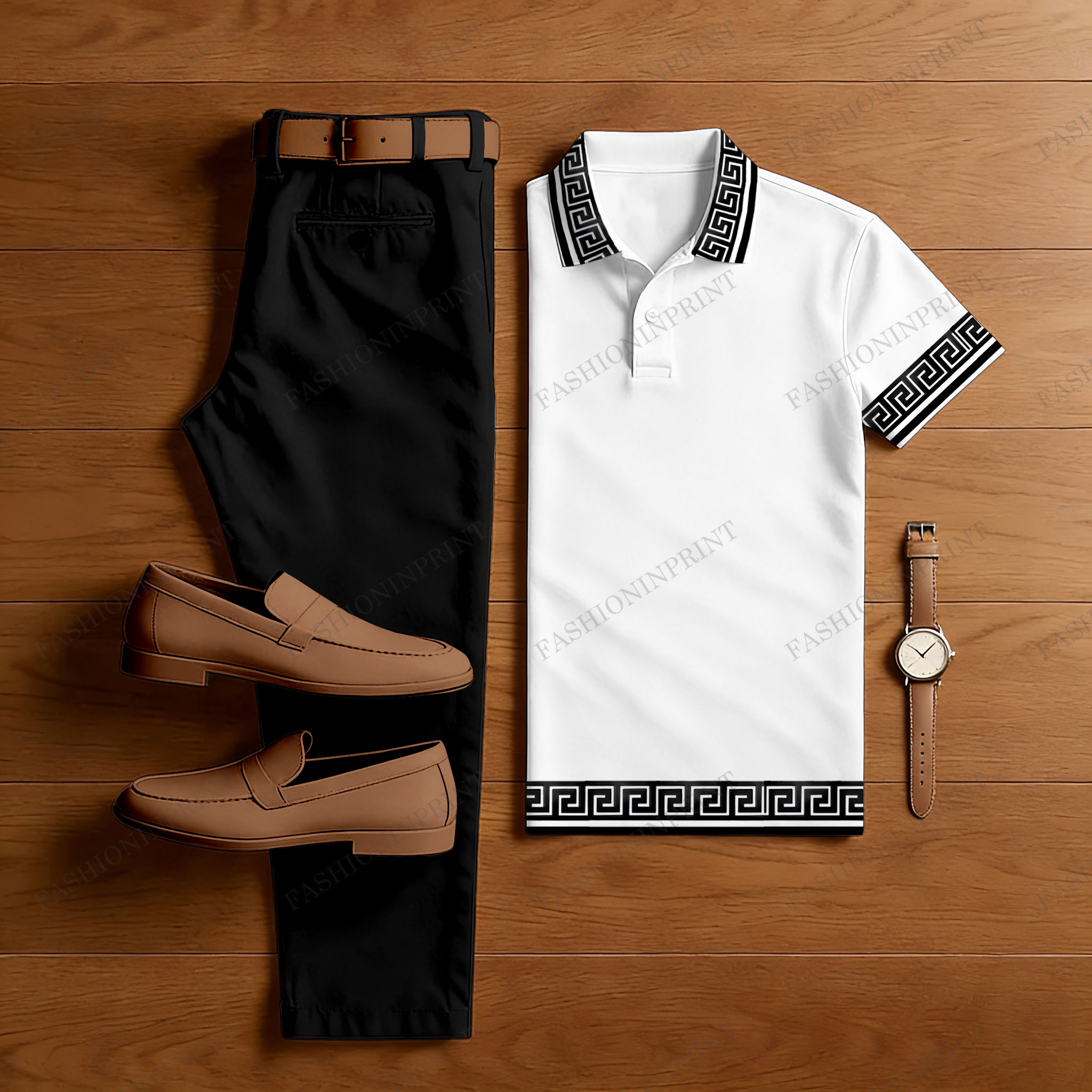 Men's Casual Black & White Color Matching Ethnic Style Printed Short Sleeved Polo Shirt & Trousers Two-Piece Set