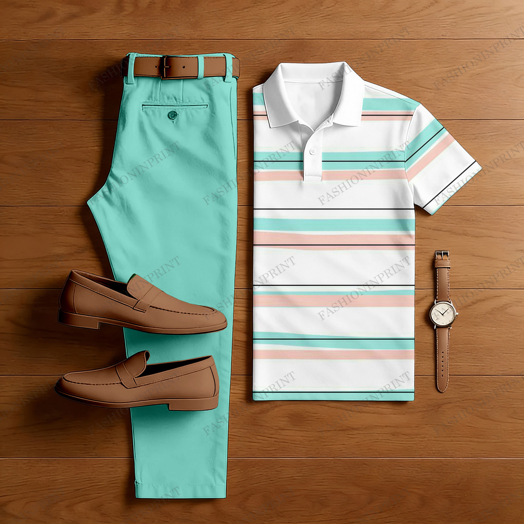 Men's Casual Lake Green & White Color Matching Striped Printed Short Sleeved Polo Shirt & Trousers Two-Piece Set