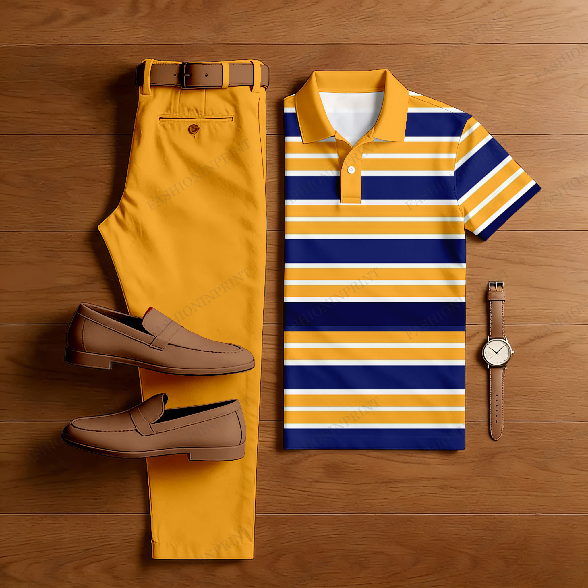 Men's Casual Ginge Yellow & Royal Blue Color Matching Striped Printed Short Sleeved Polo Shirt & Trousers Two-Piece Set