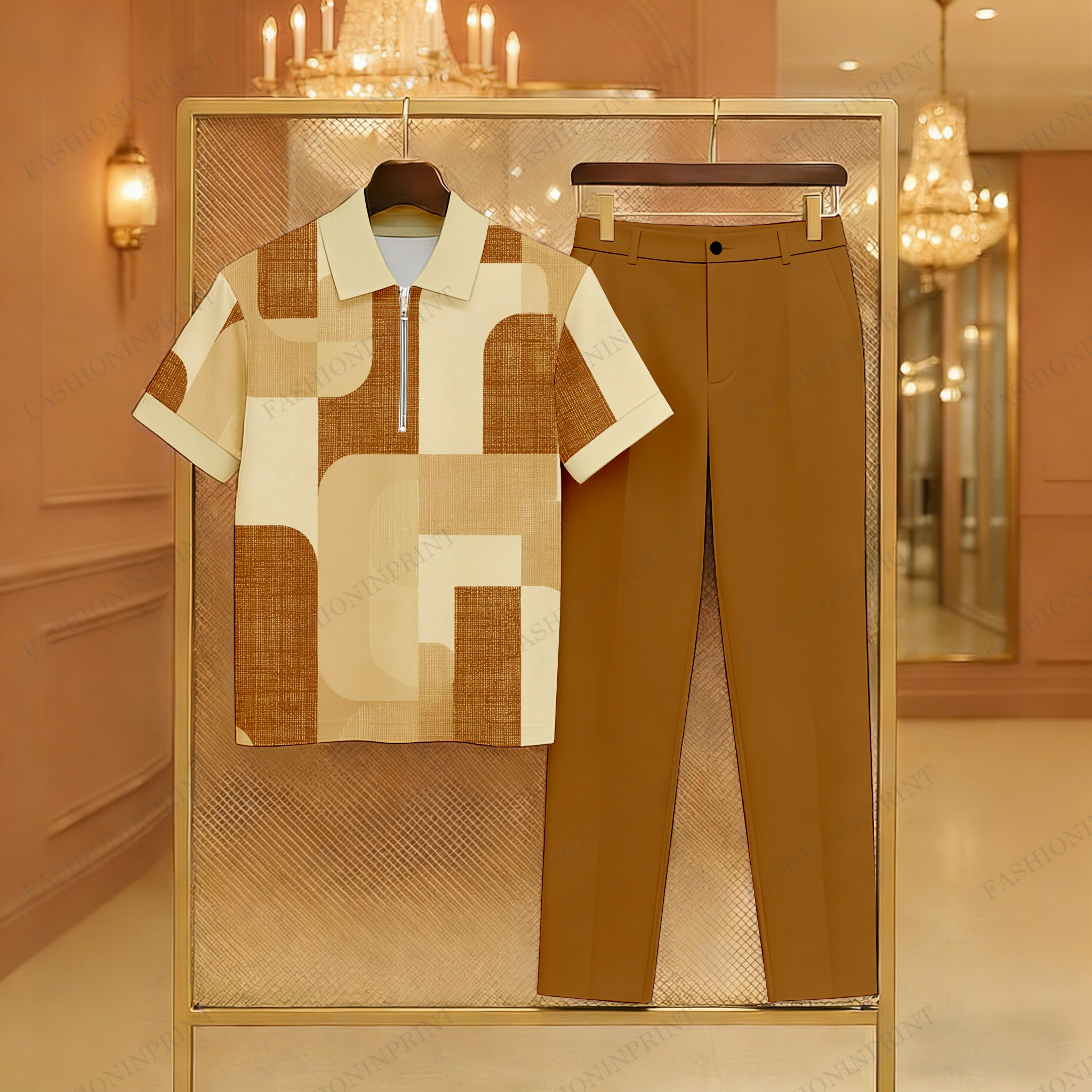 Men's Casual Orange & Yellow Color Matching Geometric Printed Zipper Short Sleeved Polo Shirt & Trousers Two-Piece Set