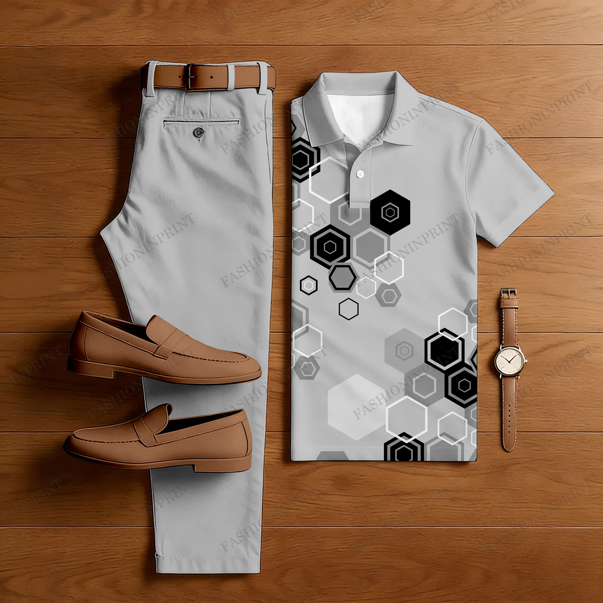 Men's Casual Gray Color Matching Geometric Printed Short Sleeved Polo Shirt & Trousers Two-Piece Set
