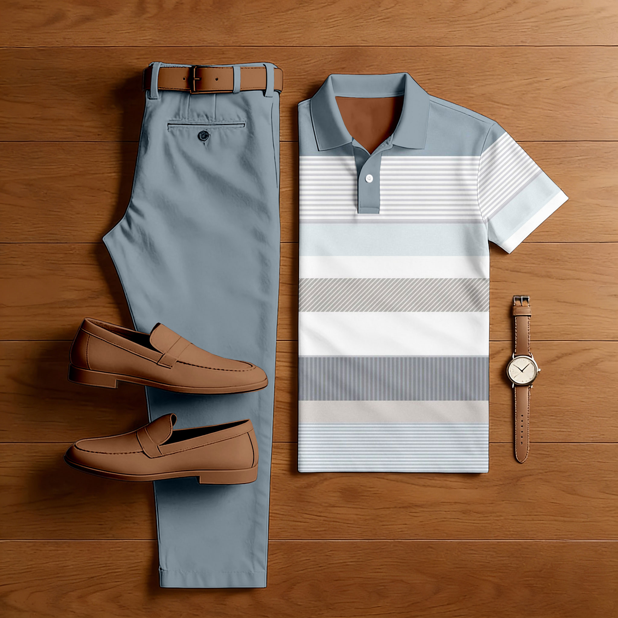 Men's Casual Light Blue & White Color Matching Striped Printed Short Sleeved Polo Shirt & Trousers Two-Piece Set
