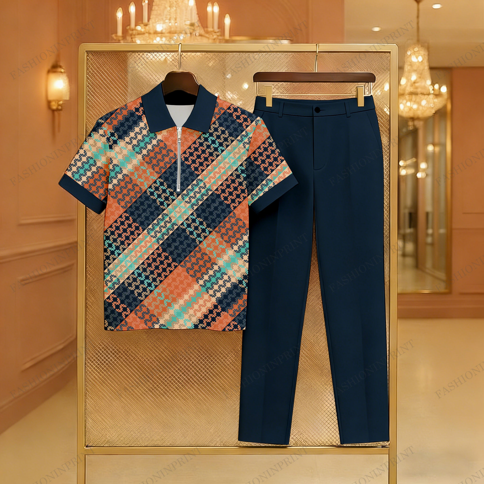 Men's Casual Multi & Dark Green Color Matching Checkered Printed Zipper Short Sleeved Polo Shirt & Trousers Two-Piece Set