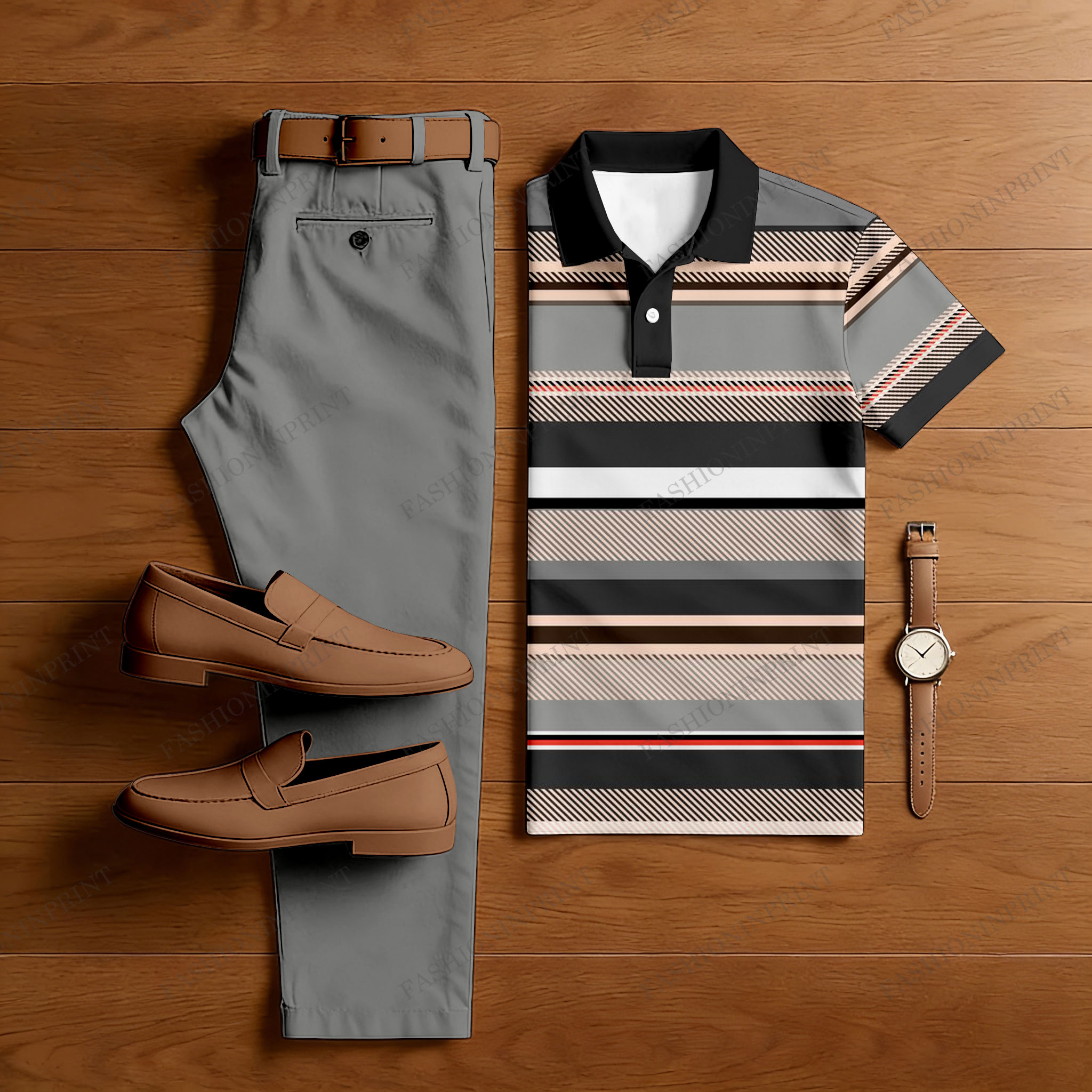 Men's Casual Multi Gray Color Matching Striped Printed Short Sleeved Polo Shirt & Trousers Two-Piece Set