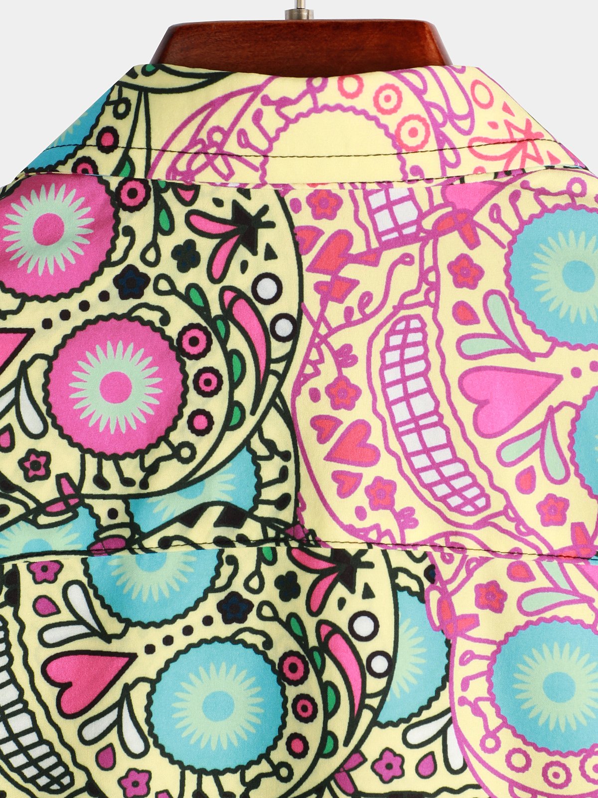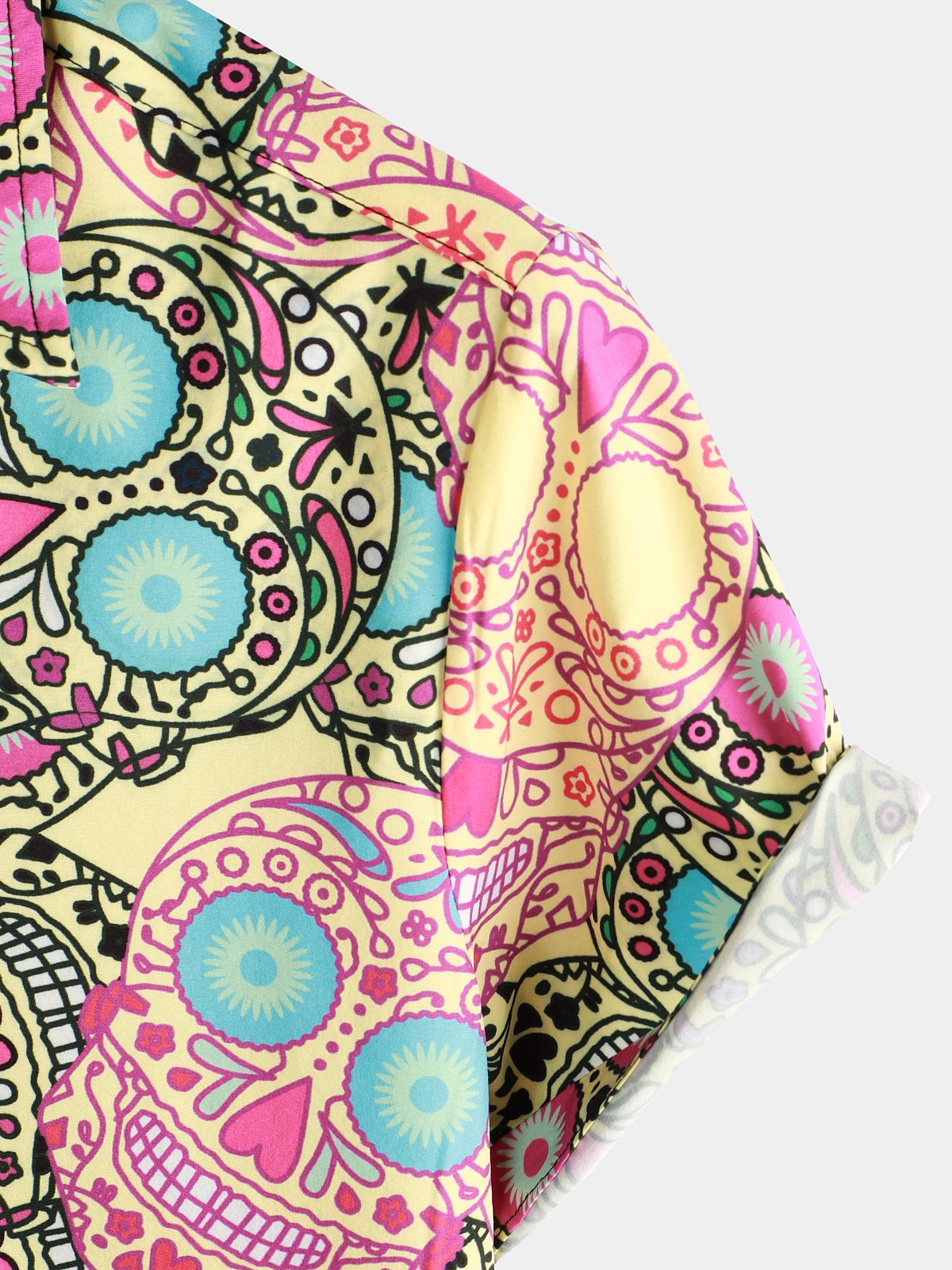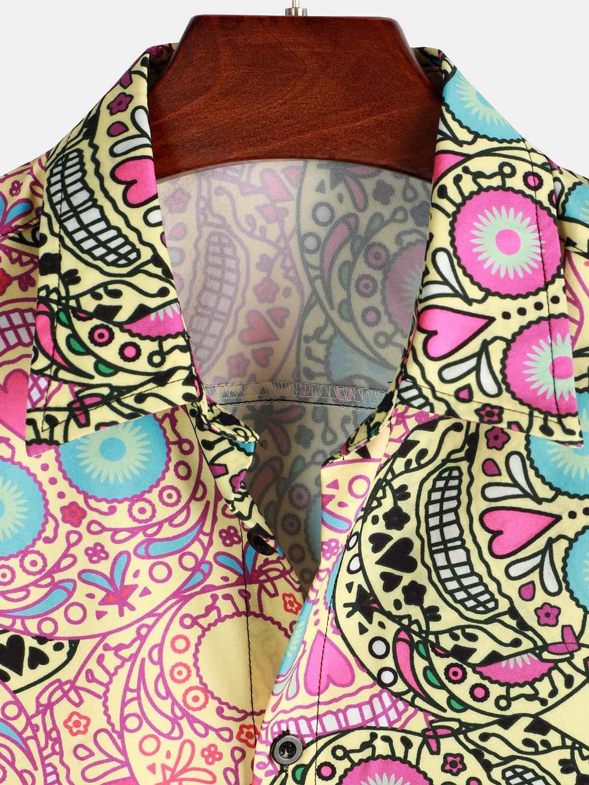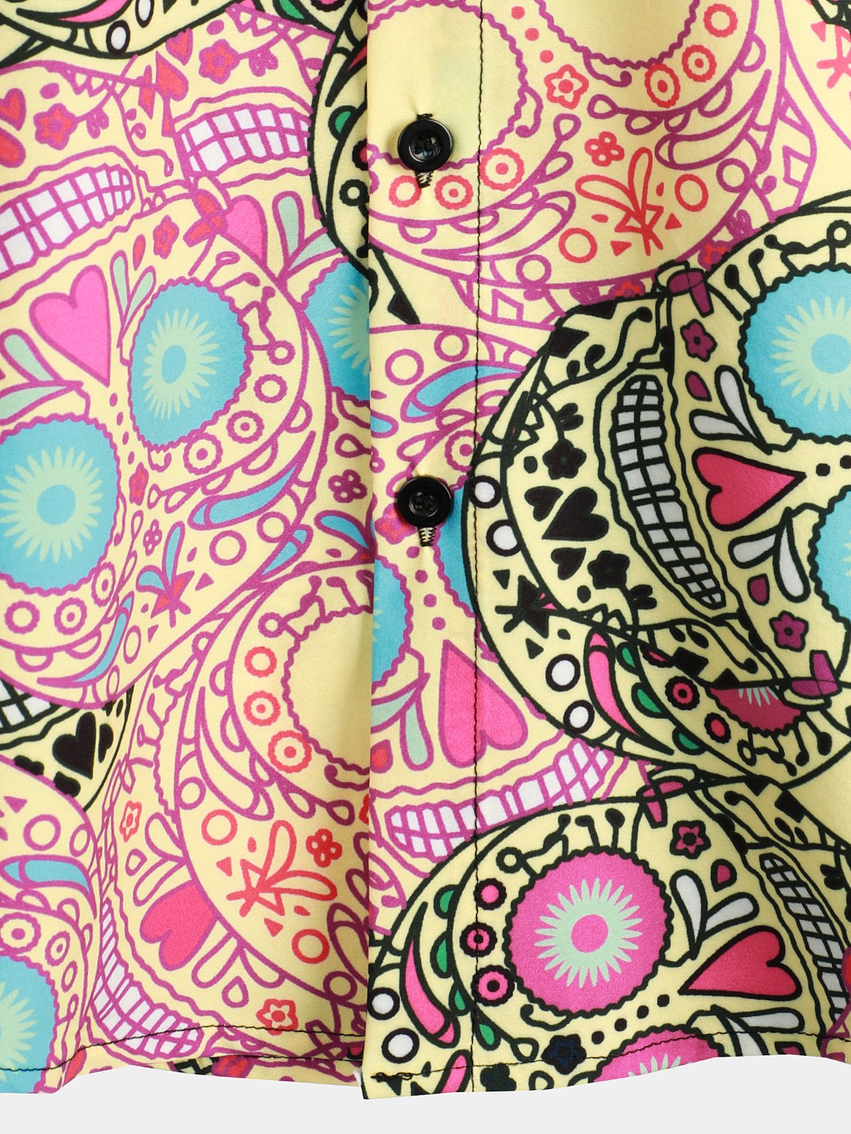 Men's Pink Funny Skull Print Short Sleeve Shirt