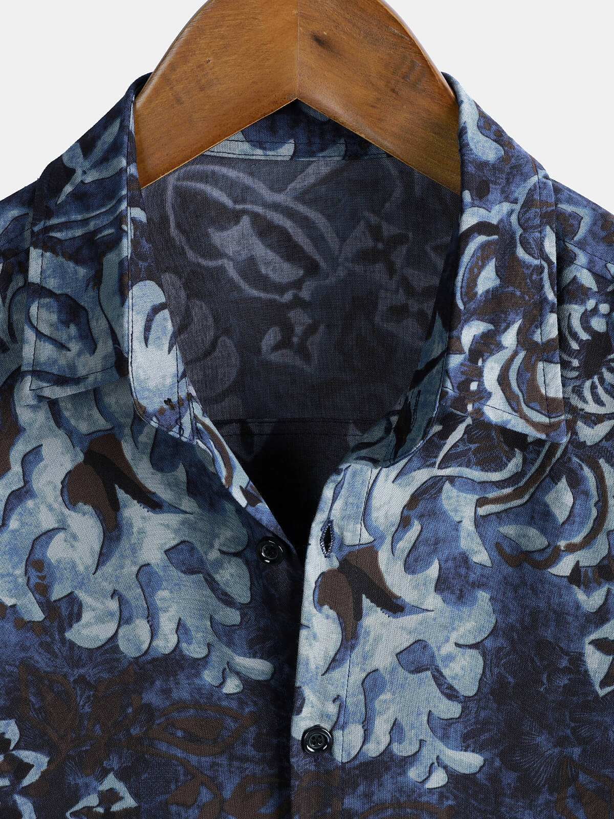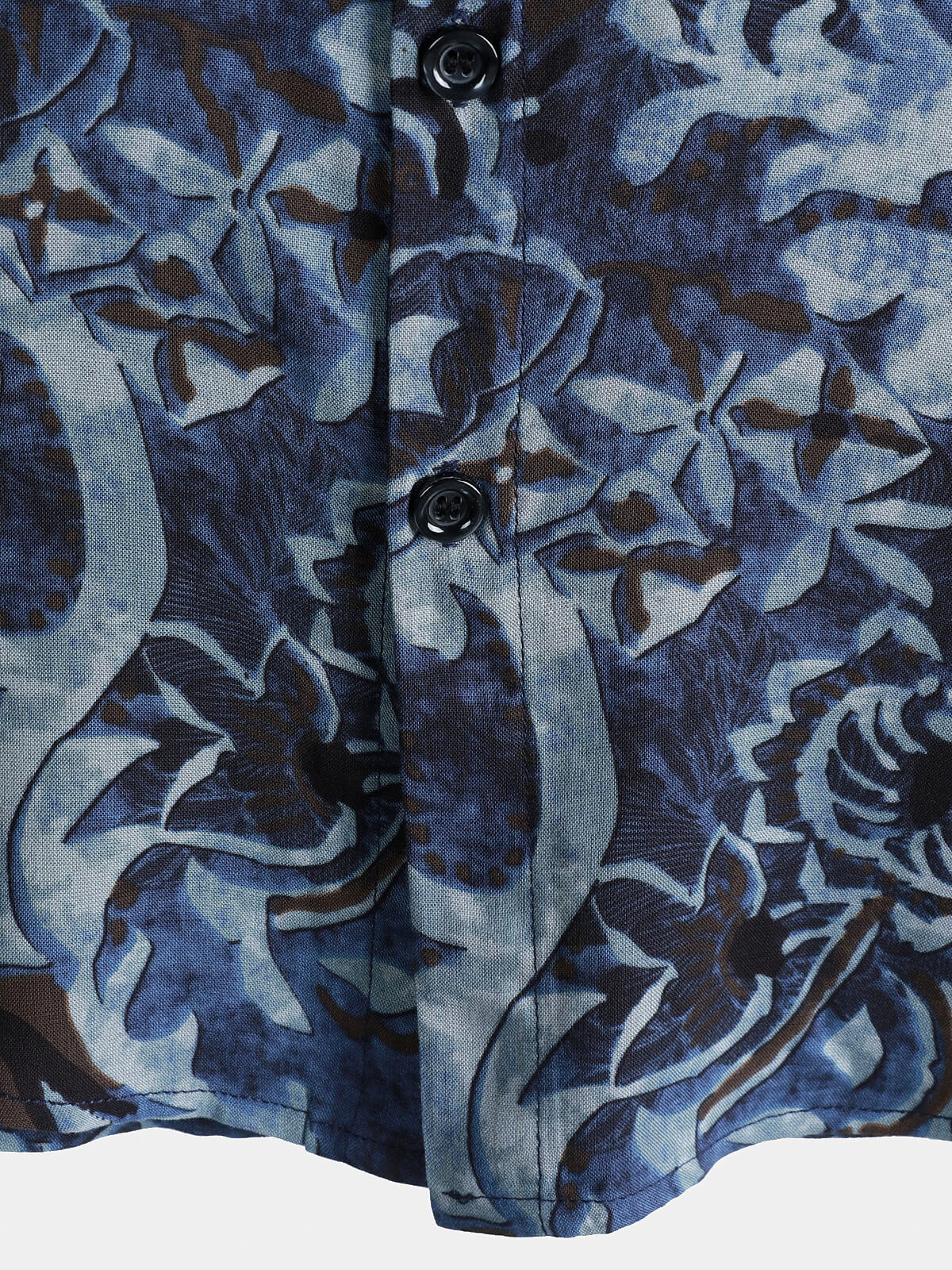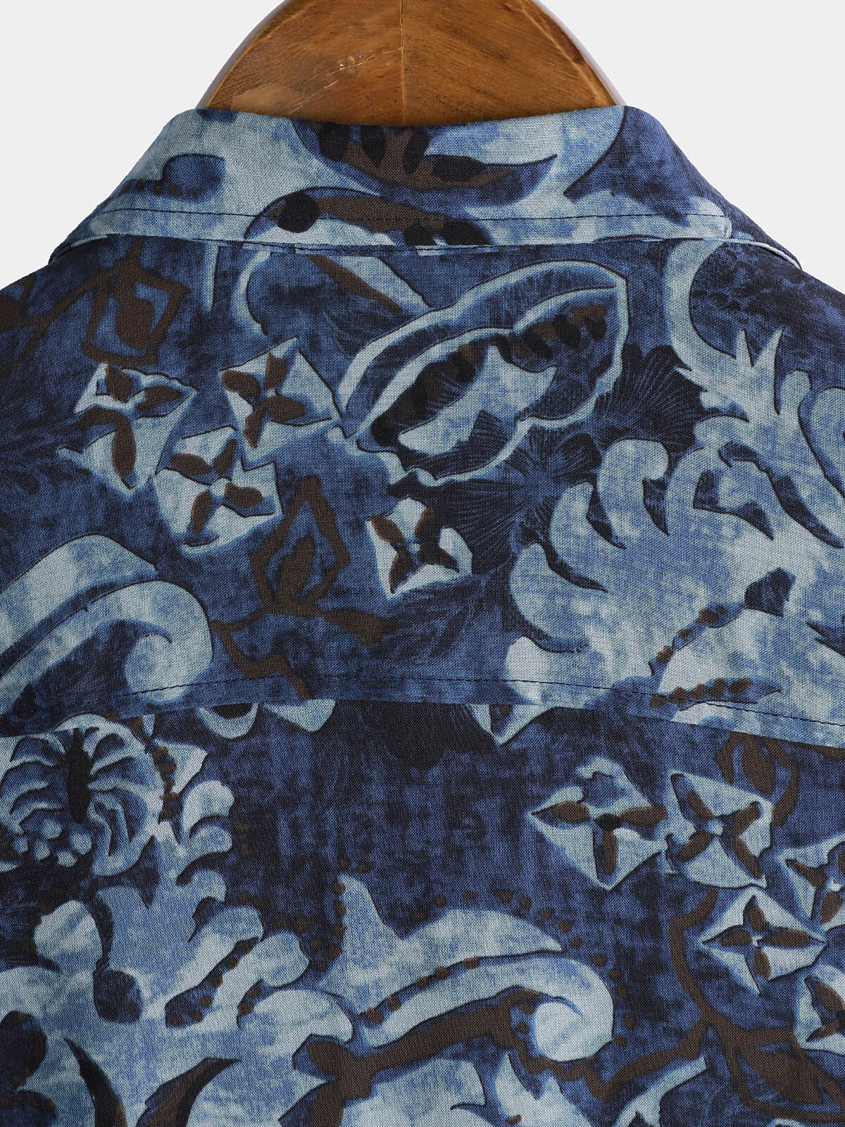 Men's Rayon Blue Floral Print Vintage Casual Short Sleeve Shirt