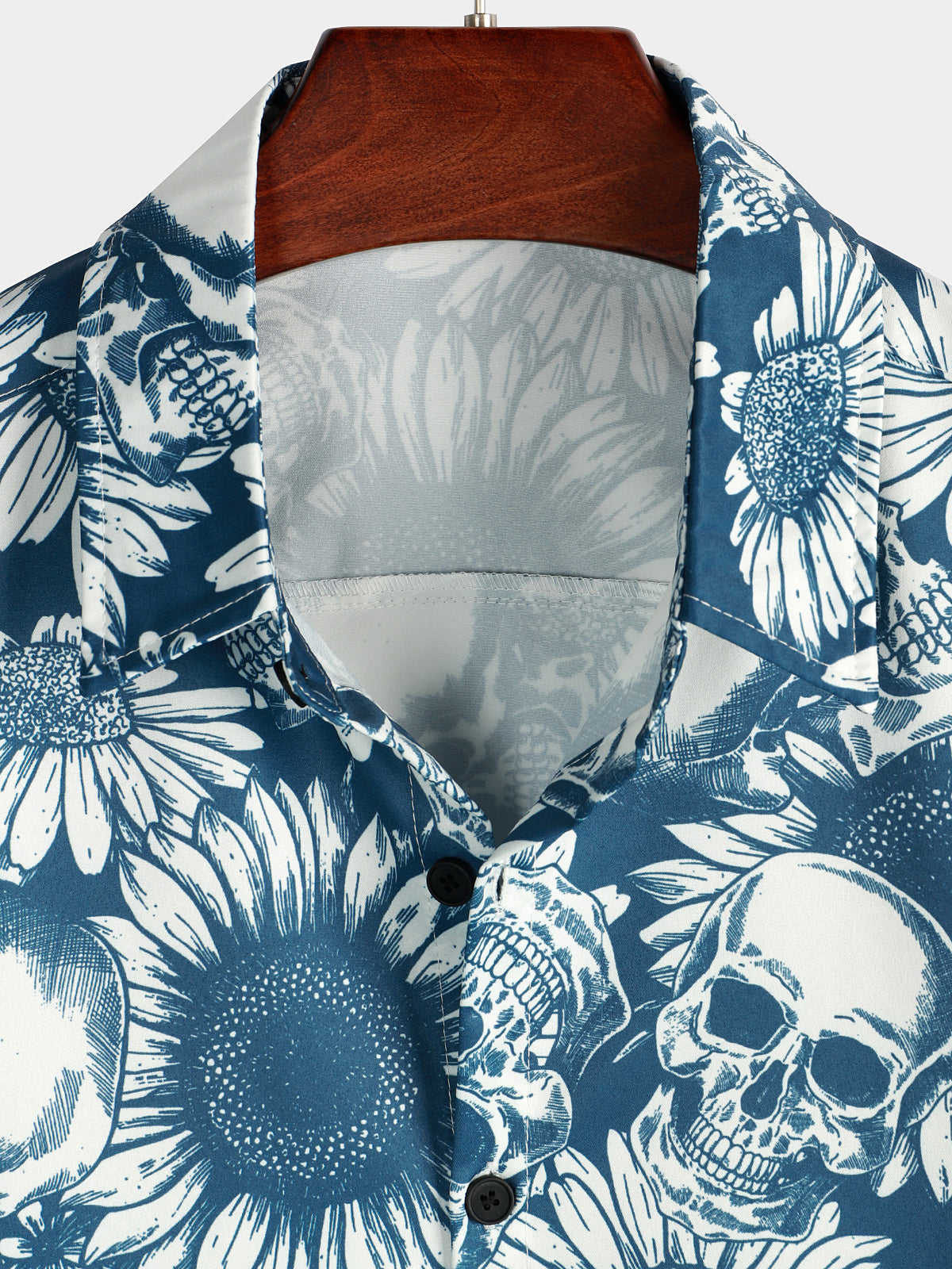 Men's Skull Sunflower Button Up Short Sleeve Art Flower Blue Rock and Roll Hawaiian Shirt