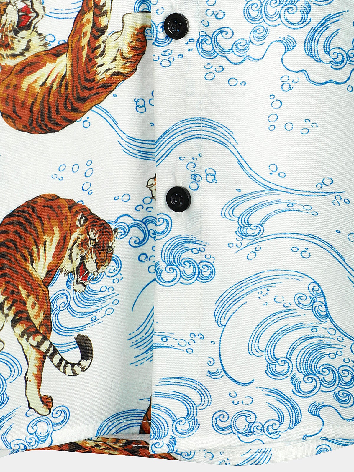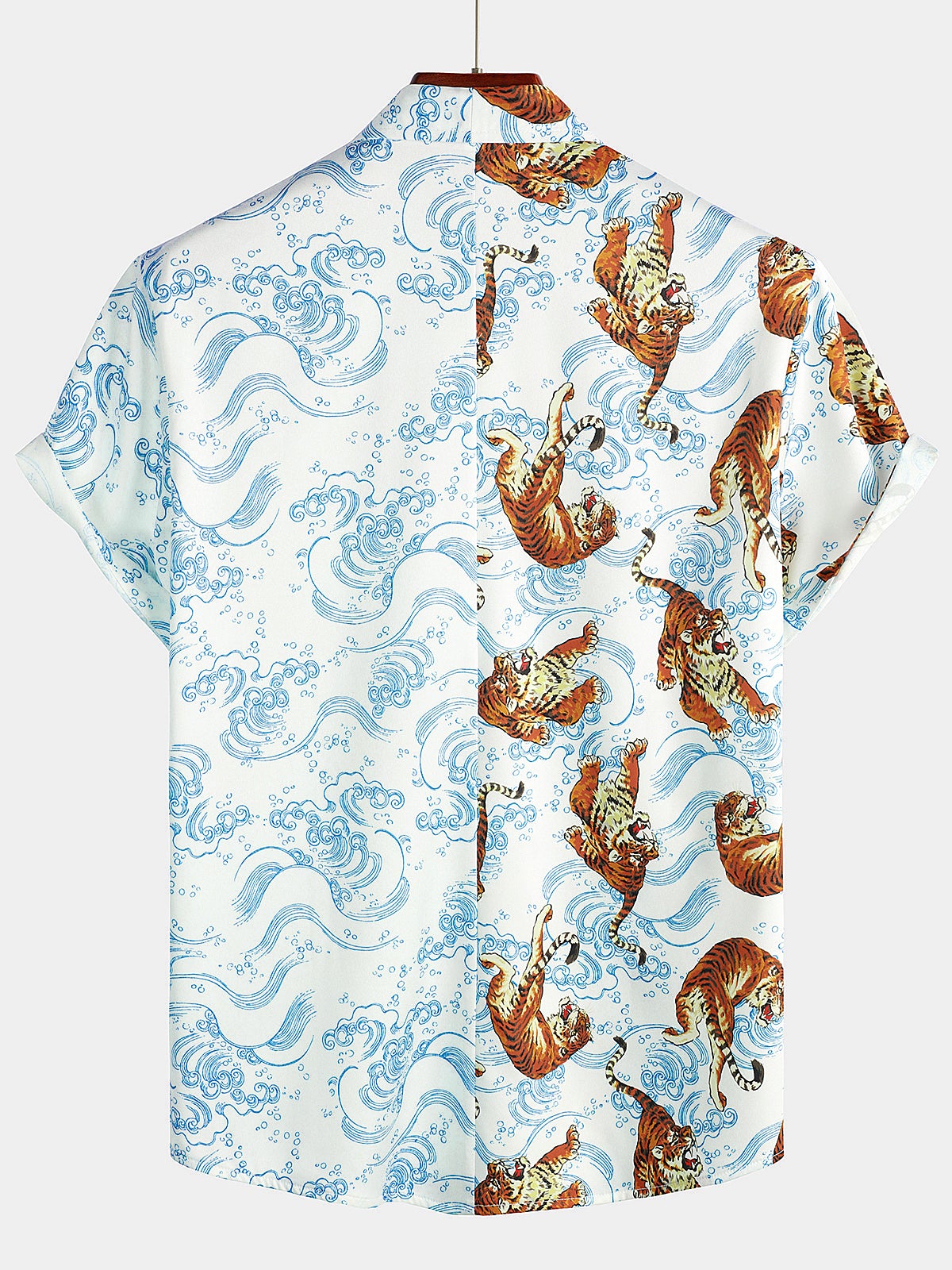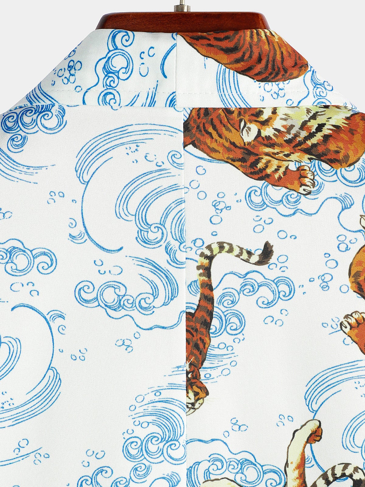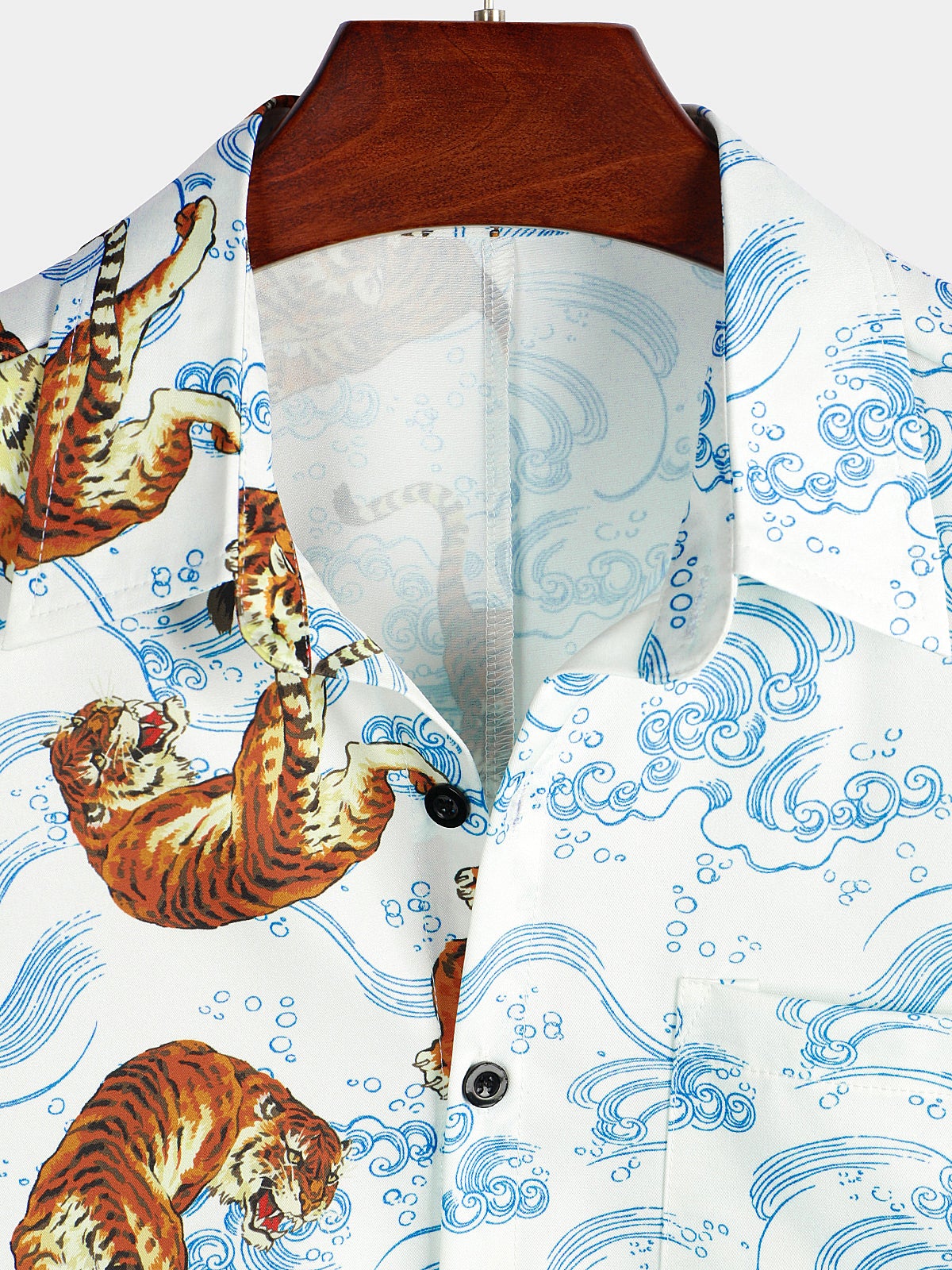 Men's Tiger Animal Print Summer Pocket Button Up Resort Summer Cool Hawaiian Short Sleeve Shirt