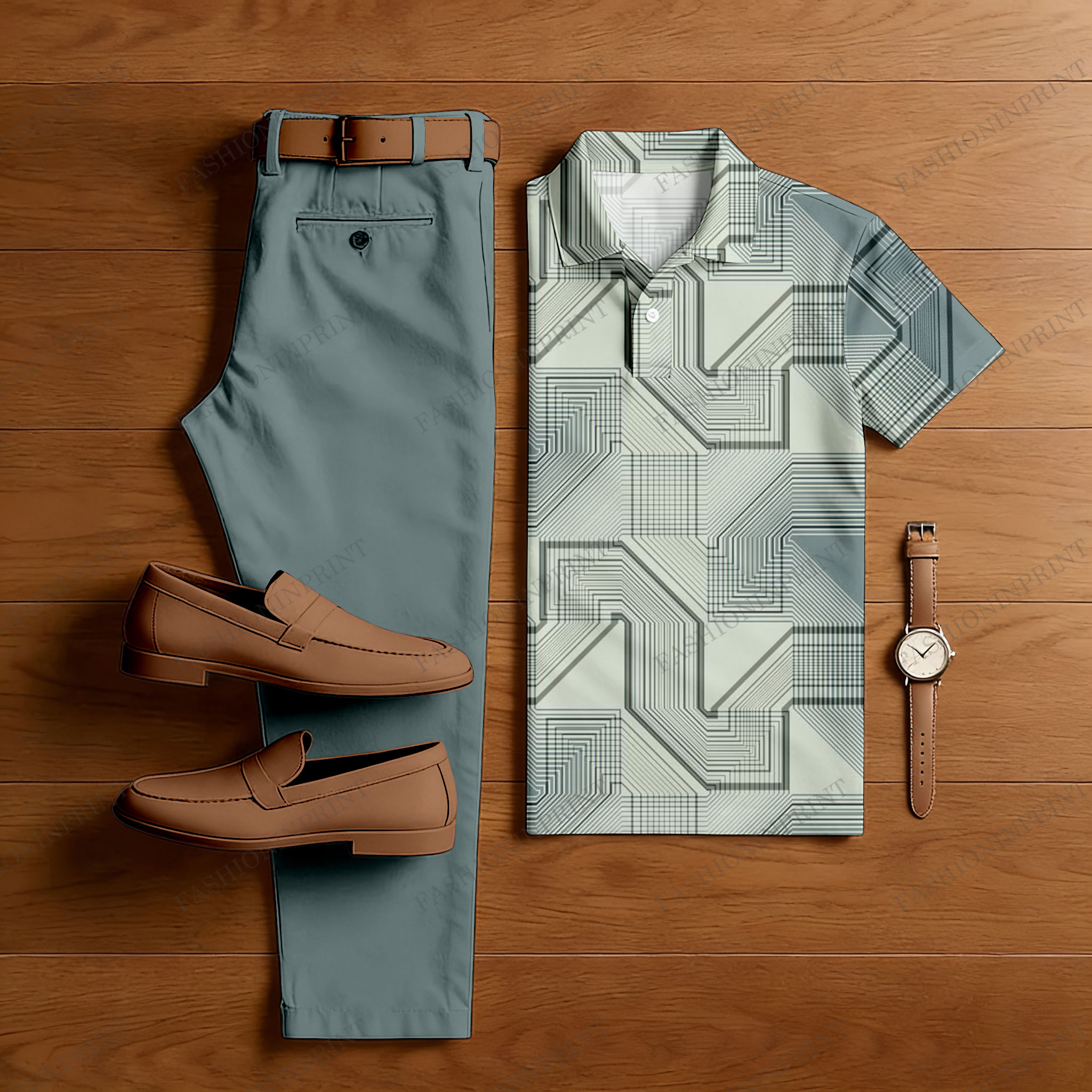 Men's Casual Light Green Gradient Gray Yellow Color Matching Checkered Printed Short Sleeved Polo Shirt & Trousers Two-Piece Set