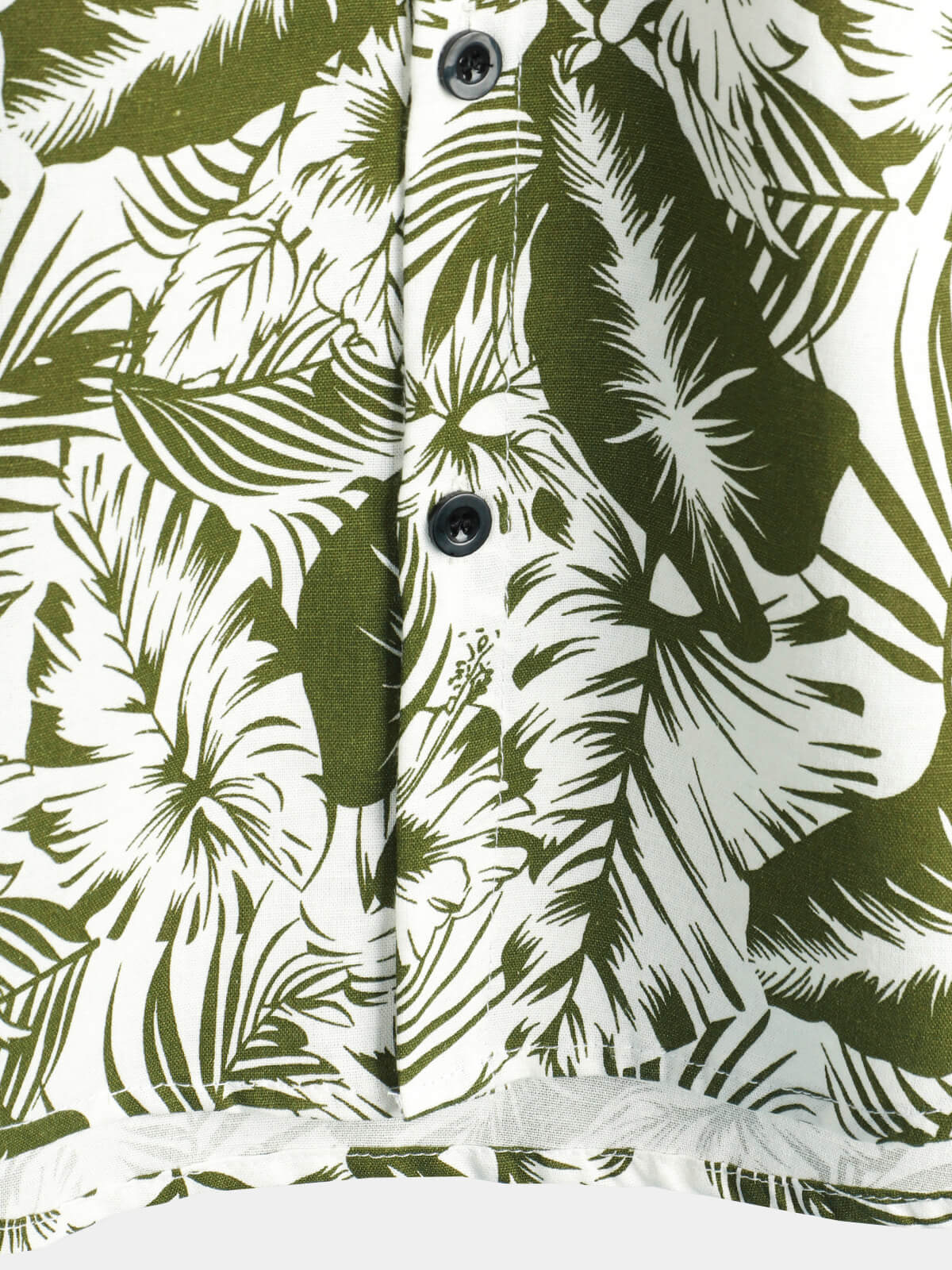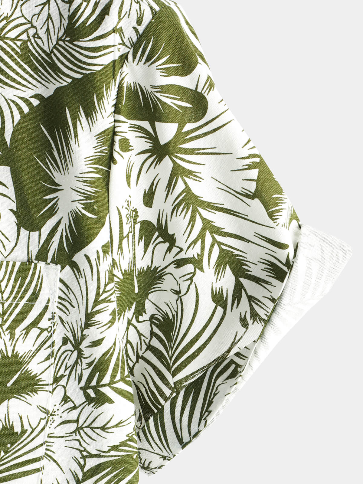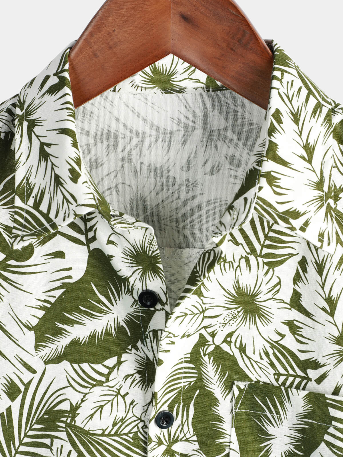Men's Tropical Floral Print Beach Pocket Cotton And Linen Summer Short Sleeve Shirt